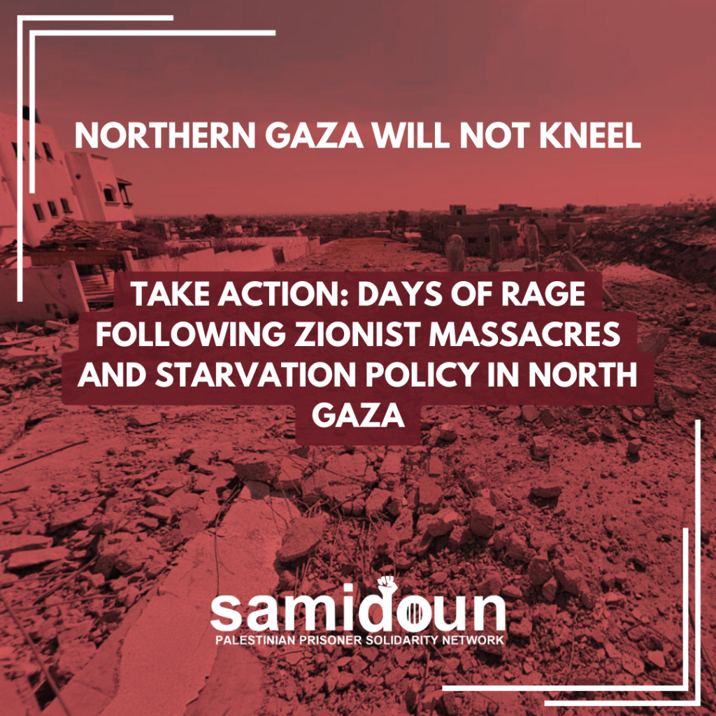 Samidoun Palestinian Prisoner Solidarity Network notes that the imperialist powers that continue to fund, arm and provide military, diplomatic and political cover to the occupation are fully complicit in the mass imprisonment of the Palestinian people, as they are in the ongoing genocide targeting Palestinians, particularly in Gaza. We urge all supporters of Palestine and mobilized Palestinian communities to take action, mobilize, demonstrate and organize direct actions to confront the imperialist-Zionist war machine and demand an end to administrative detention, the liberation of all administrative detainees, and the liberation of every Palestinian prisoner in Zionist, imperialist, PA and reactionary jails — part and parcel of the liberation of Palestine from the river to the sea.
