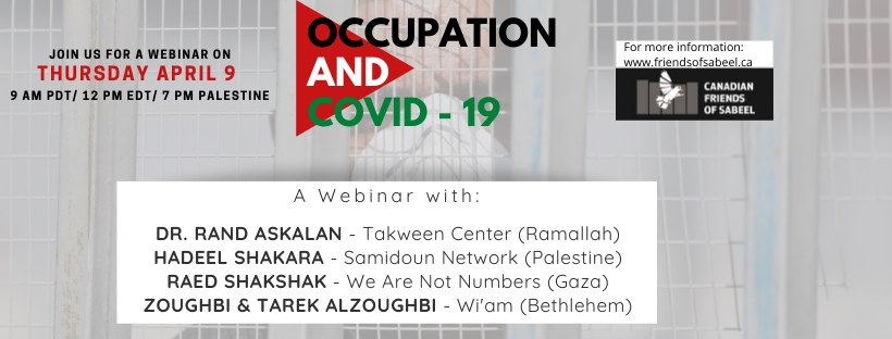 - Participate in an online event: Yafa Jarrar, Ghassan Abu Sitta and Tarek Loubani will speak on a webinar about COVID-19 and Palestine. 10 am Pacific/1 pm Eastern/7 pm Europe/8 pm Palestine. Event organized by University of Toronto Divest. Register online here: https://www.eventbrite.ca/e/contain-the-pandemic-free-palestine-tickets-101936476746