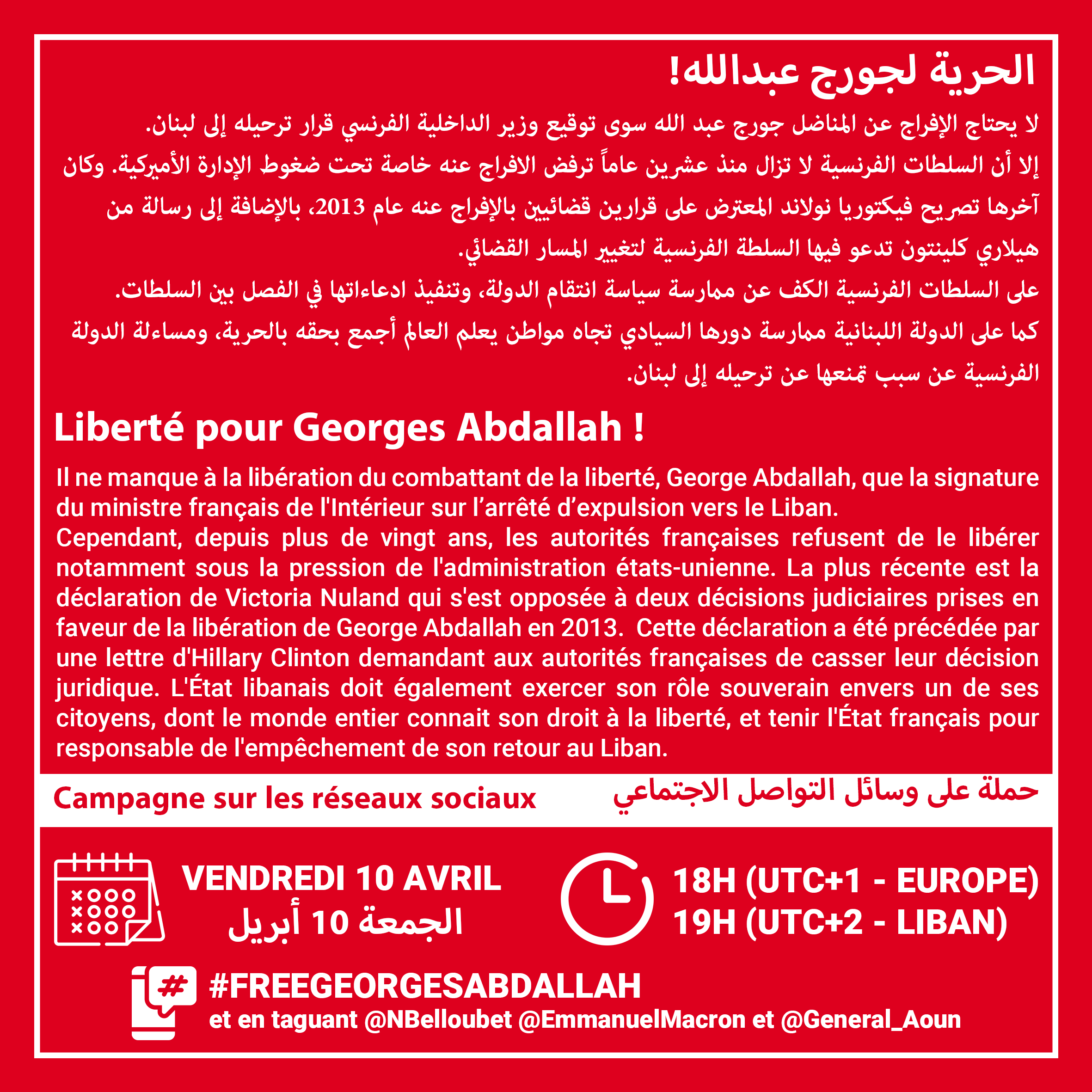 - Join the Twitterstorm to Free Georges Abdallah! 9 am Pacific/12 pm Eastern/6 pm Europe/7 pm Palestine and Lebanon. Use the hashtag #FreeGeorgesAbdallah and tag @NBelloubet @EmmanuelMacron and @General_Aoun
