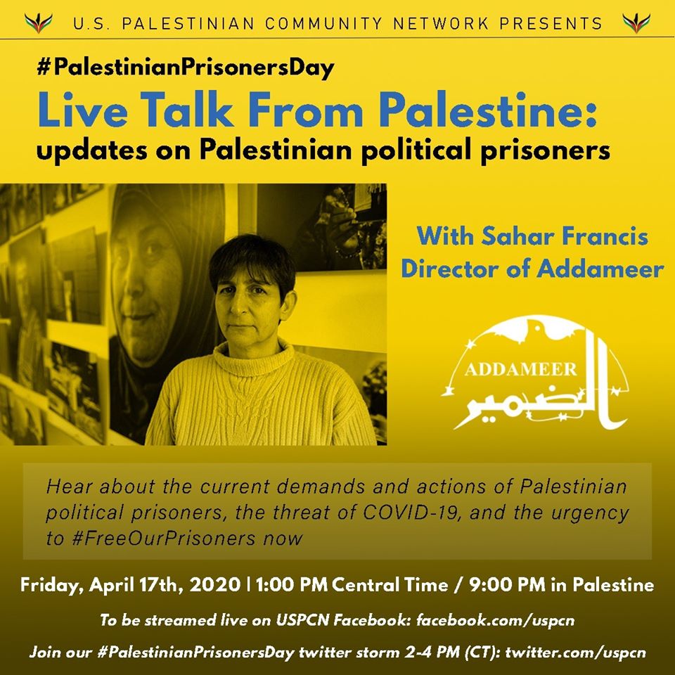- Participate in the Facebook Live featuring Sahar Francis of Addameer, organized by the US Palestinian Community Network at 11 am Pacific, 2 pm Eastern, 8 pm Europe, 9 pm Palestine at https://www.facebook.com/USPCN/