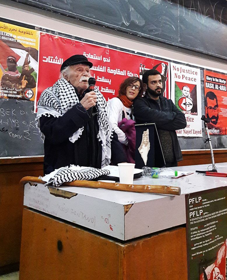 On 20 December 2017, at an event organized by Samidoun in Athens marking 50 years of struggle of the Palestinian revolutionary left, two Palestinian youth presented him with a kuffiyeh and a map of Palestine to honor his lifelong commitment to liberation and his many years of struggle. Glezos addressed the event, speaking about his own history with Palestine solidarity and today’s situation, with Trump recognizing al-Quds (Jerusalem) as the capital of Israel. Glezos noted that Trump does not represent the people of the United States but himself and the ruling class, emphasizing that he has no right to decide to whom al-Quds belongs and that it is the rightful capital of the Palestinian people.