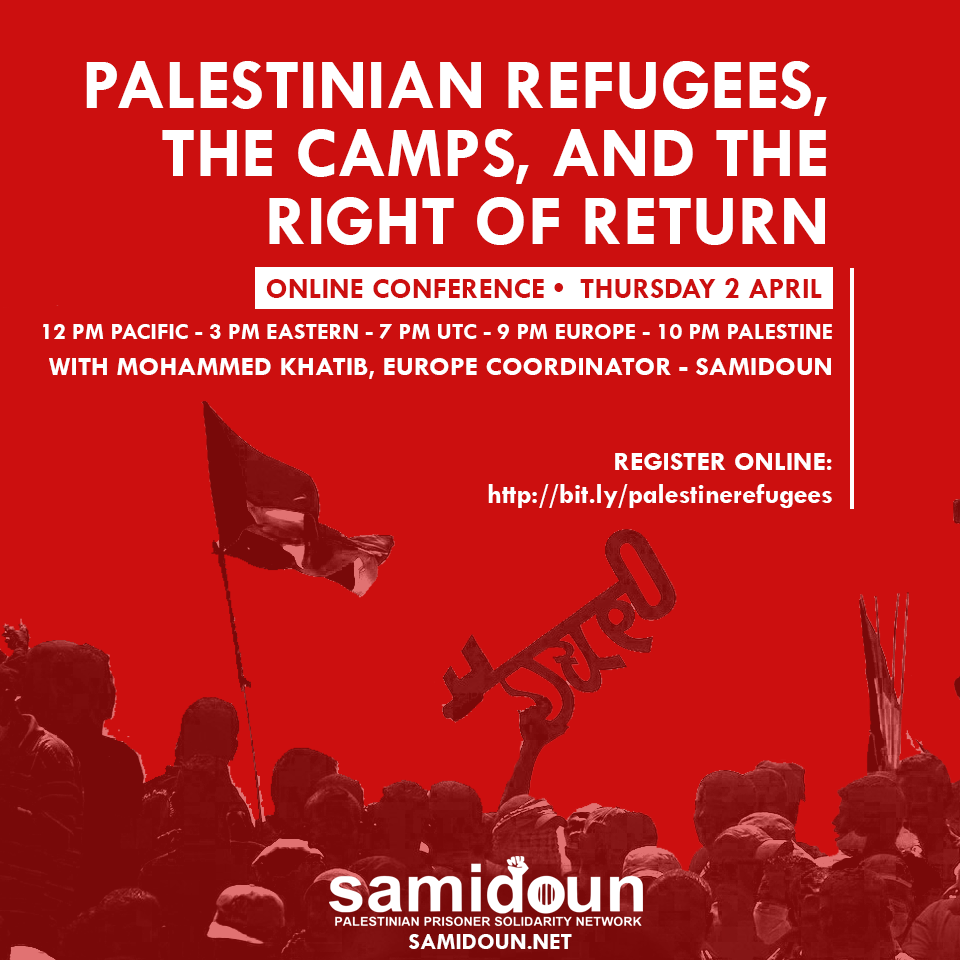 Join Samidoun Palestinian Prisoner Solidarity Network for an online webinar on Palestinian refugees, the camps and the Right of Return with Mohammed Khatib, Europe coordinator of the Samidoun Palestinian Prisoner Solidarity Network and a Palestinian refugee born in Ein el-Helweh camp.