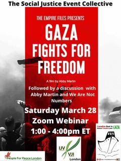 Please join The Canadian Boat to Gaza campaign for a film webinar for the screening of Gaza Fights for Freedom, a film by US journalist Abby Martin.