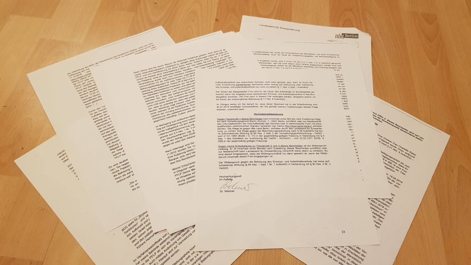 Legal document provided to Khaled Barakat by German immigration officials, ordering him barred from the country for four years.