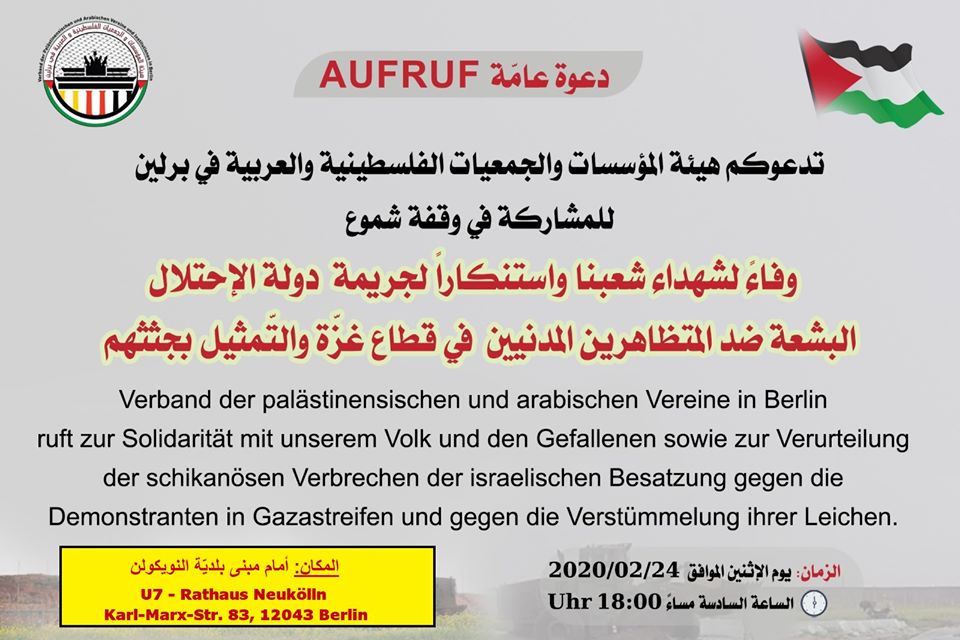 The demonstration, held outside the city hall in Berlin’s Neukölln district on Karl-Marx-Strasse, was sparked by Israeli occupation attacks on Gaza, including repeated bombing raids and the killing of Mohammed Ali al-Naim, a 27-year-old man shot dead by Israeli occupation forces whose body was later dragged by a bulldozer in widely circulated footage.
