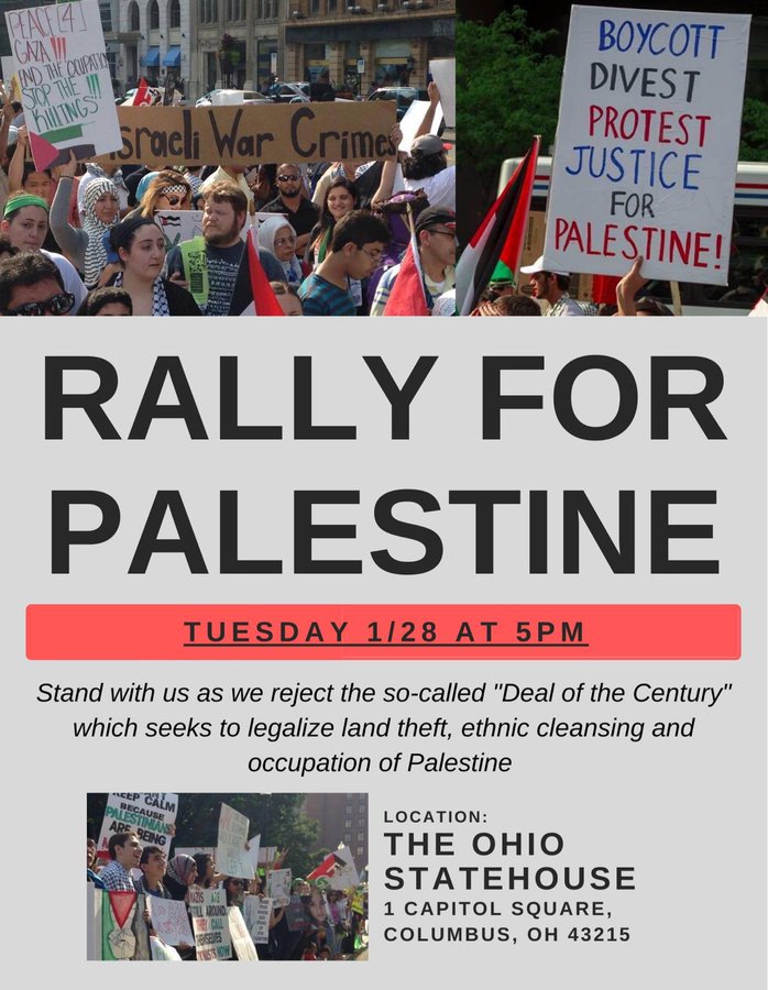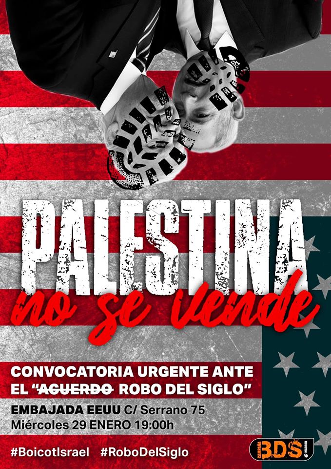 Mañana nos concentramos de urgencia ante la embajada yanki para protestar por el autodenominado Acuerdo del Siglo, firmado por EEUU e Israel, donde los yankis le dan luz verde a la clásica política israelí de la ocupación permanente, colonialismo y apartheid sobre la población palestina. Este nuevo trazado incluye la limpieza etnica de Jerusalem, el robo del 40% de las tierras palestinas actuales a cambio de 50 mil millones de dólares.