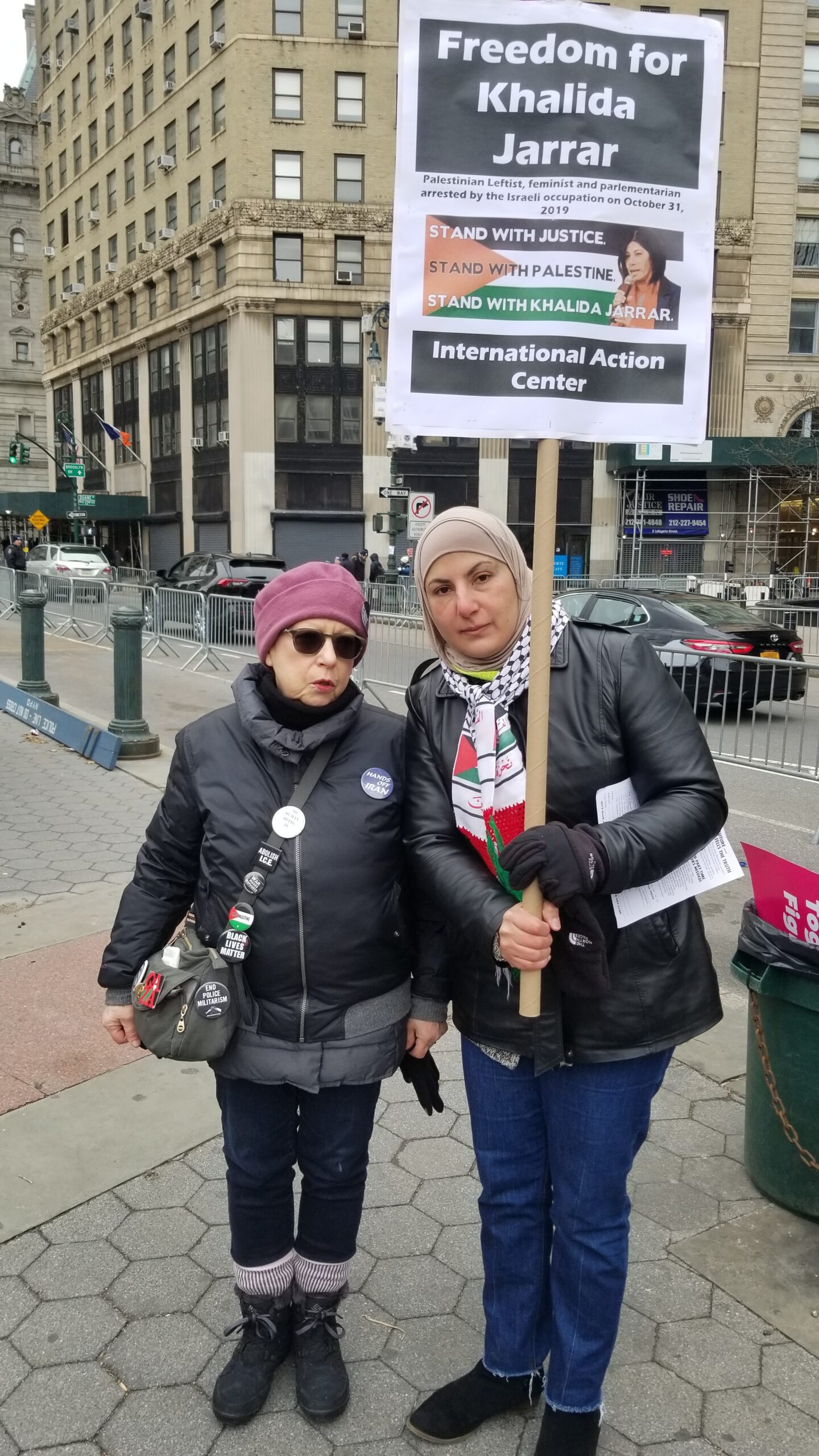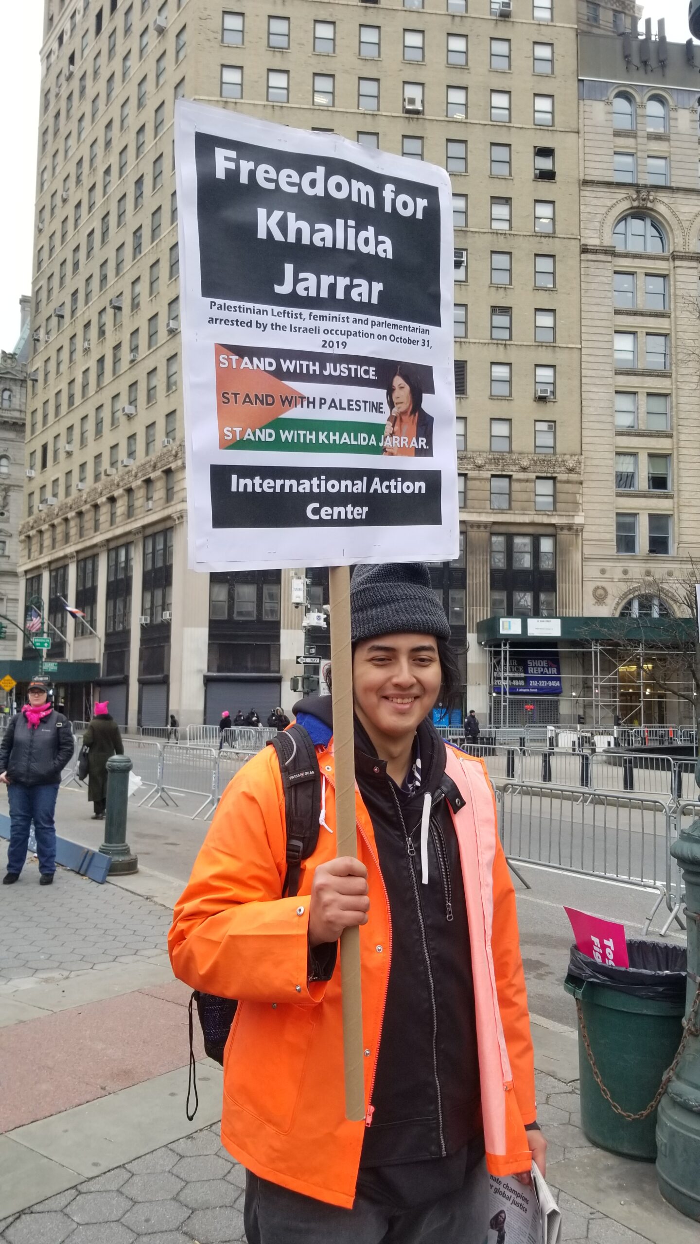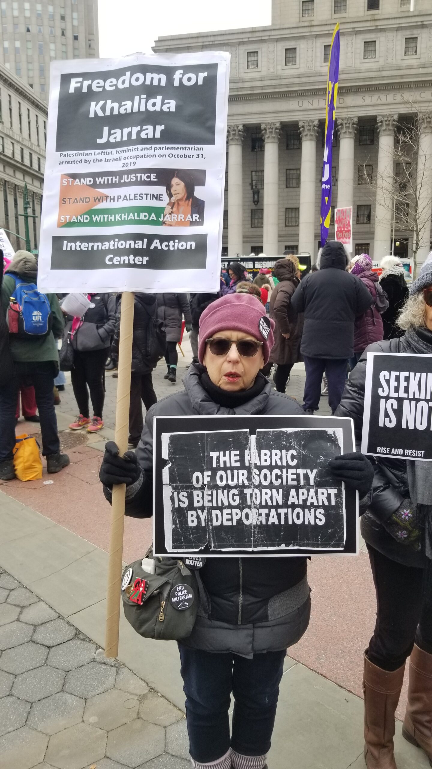 Participants in the Women’s March in New York City highlighted the case of imprisoned Palestinian leftist, feminist and parliamentarian Khalida Jarrar on Saturday, 18 January. Members of Samidoun New York and the International Action Center carried signs and distributed materials highlighting the struggles of Palestinian women prisoners in Israeli jails.