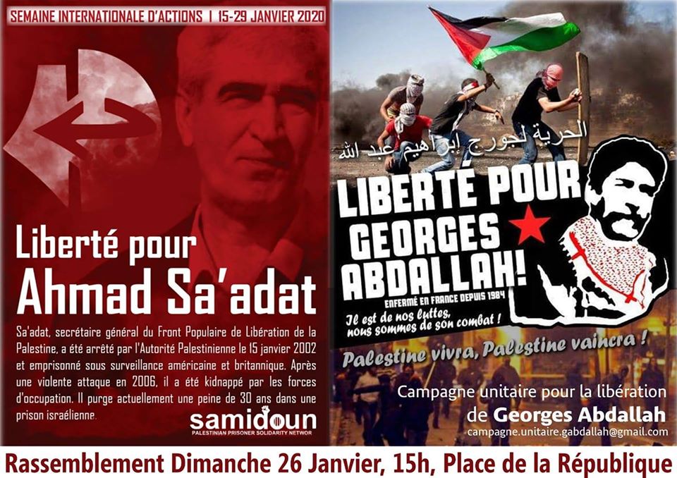 Rassemblement samedi dimanche 26 janvier 2020, de 15h à 17h, pour exiger la libération d’Ahmad Sa’adat, de Georges Abdallah et de tous les prisonniers palestiniens.