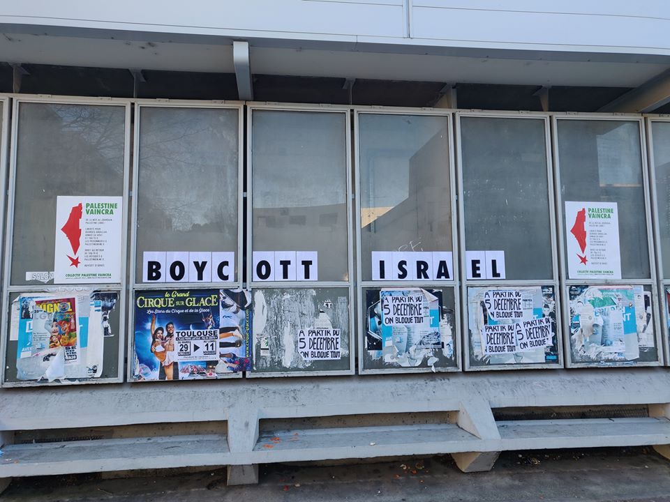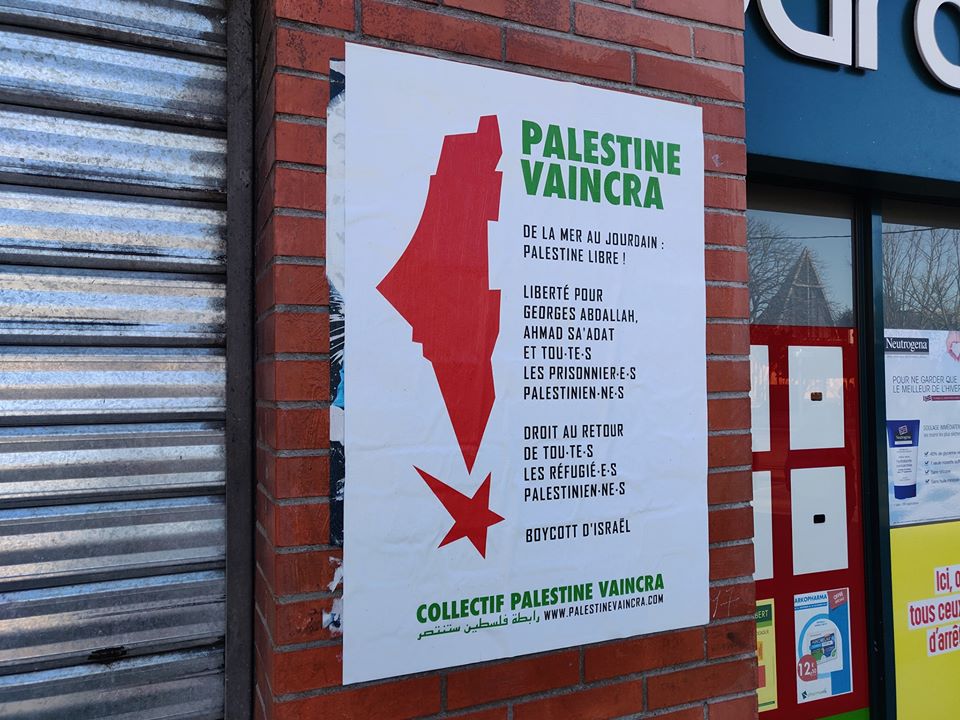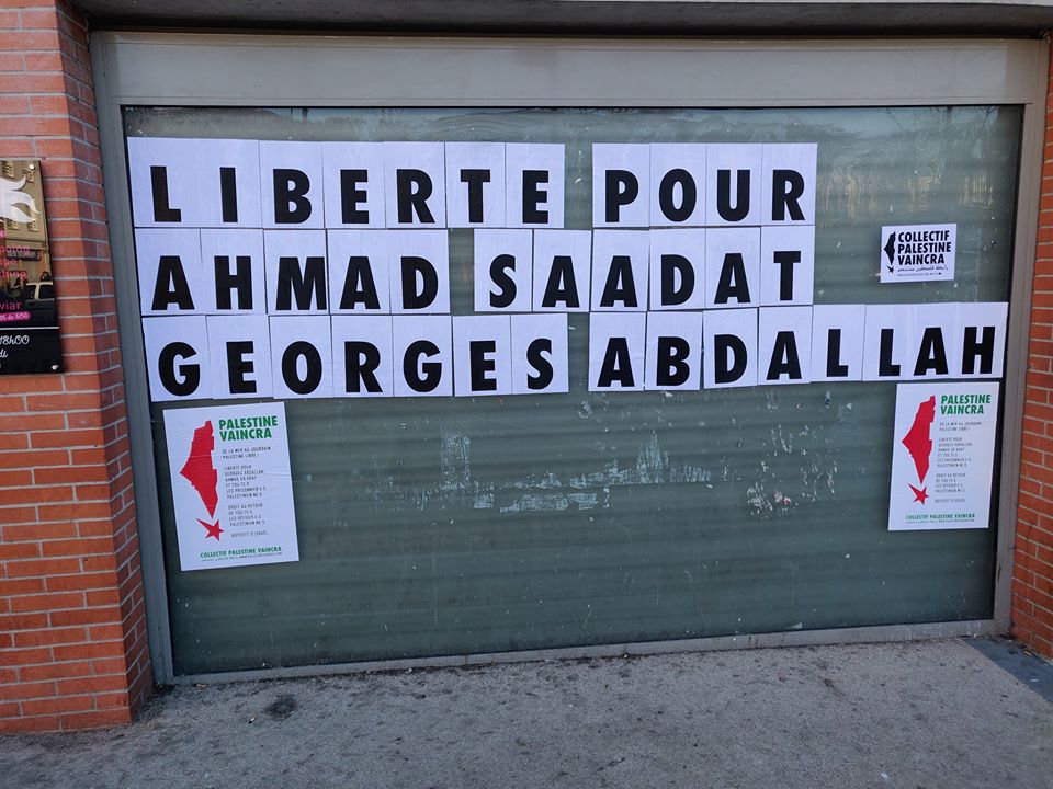 In Toulouse, Collectif Palestine Vaincra, a member of the Samidoun Palestinian Prisoner Solidarity Network, continued its activities for the Weeks of Action one day after a successful Palestine stand in the city center. They put up posters and signs calling for freedom for Ahmad Sa’adat and Georges Ibrahim Abdallah in the Bagatelle district, highlighting the call for the boycott of Israel.