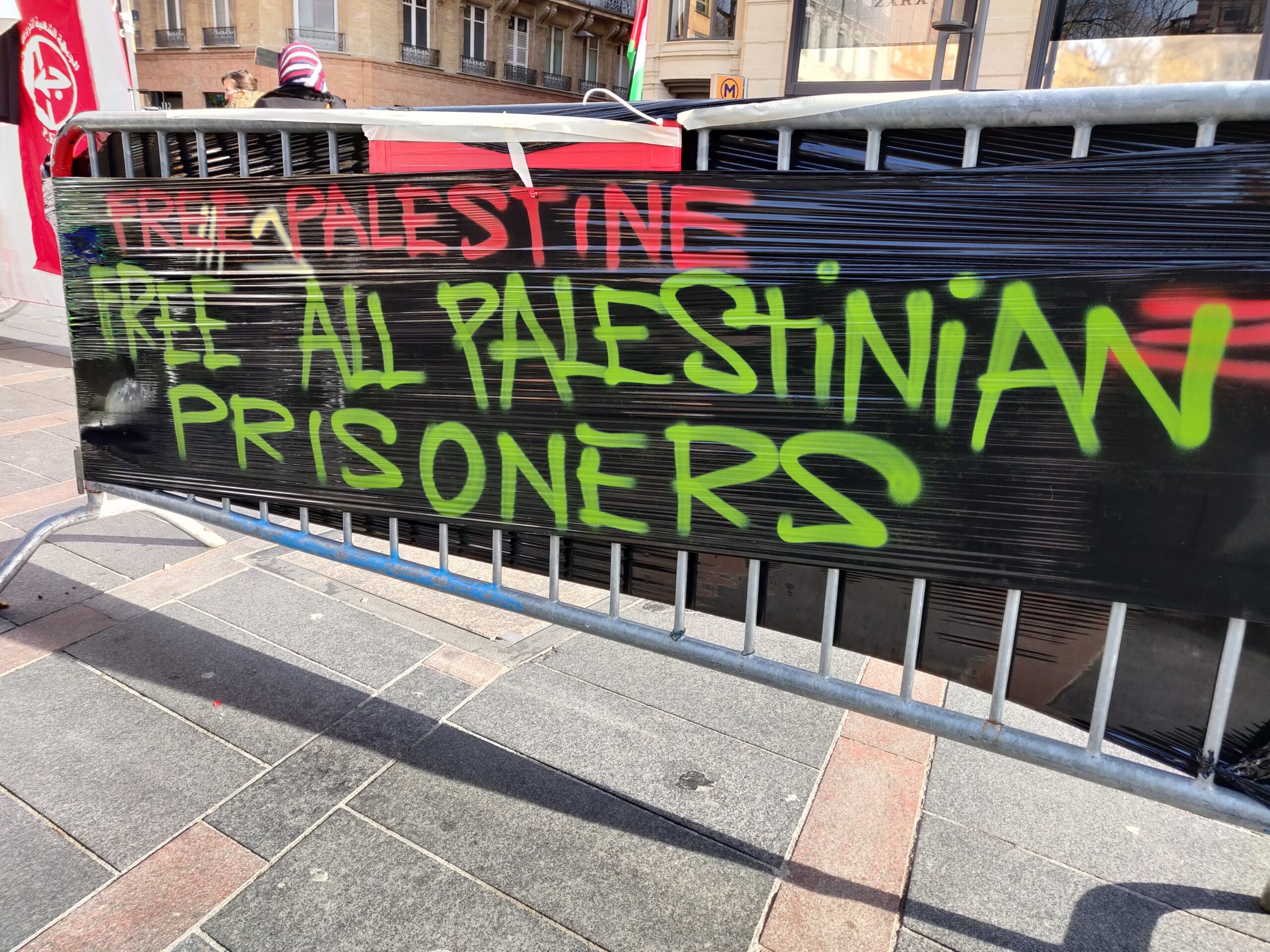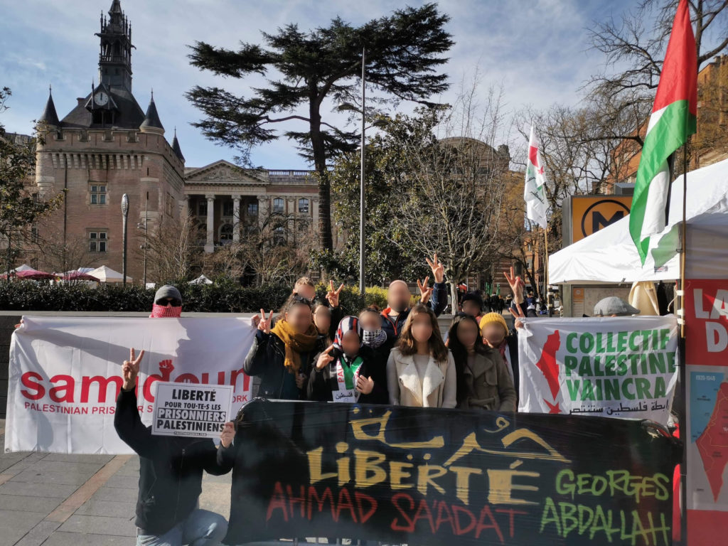 On Saturday, 18 January, activists and supporters of the Collectif Palestine Vaincra, an affiliate of Samidoun Palestinian Prisoner Solidarity Network, gathered for a Palestine stand for over two hours near the entrance to Metro Capitole in Toulouse, France. The stand came as part of the international weeks of action to Free Ahmad Sa’adat and all Palestinian prisoners, taking place from 15 to 29 January 2020 and marking the anniversary of the imprisonment of the general secretary of the Popular Front for the Liberation of Palestine in 2002 – first by the Palestinian Authority under U.S. and British guard, and now by the Israeli occupation.