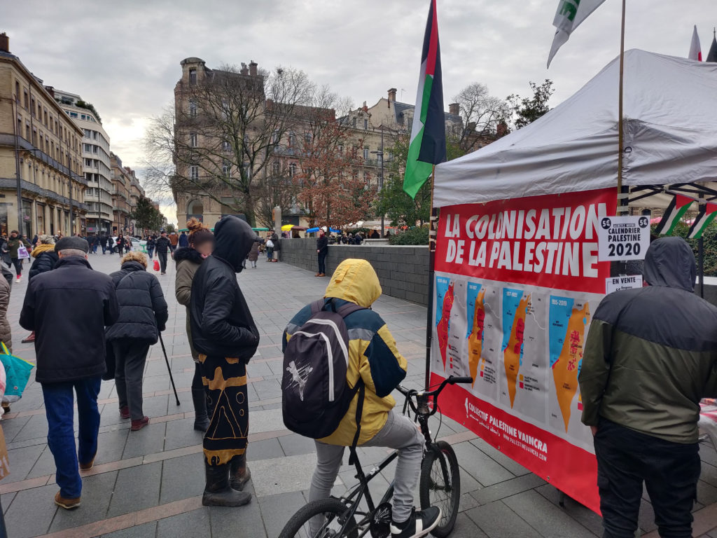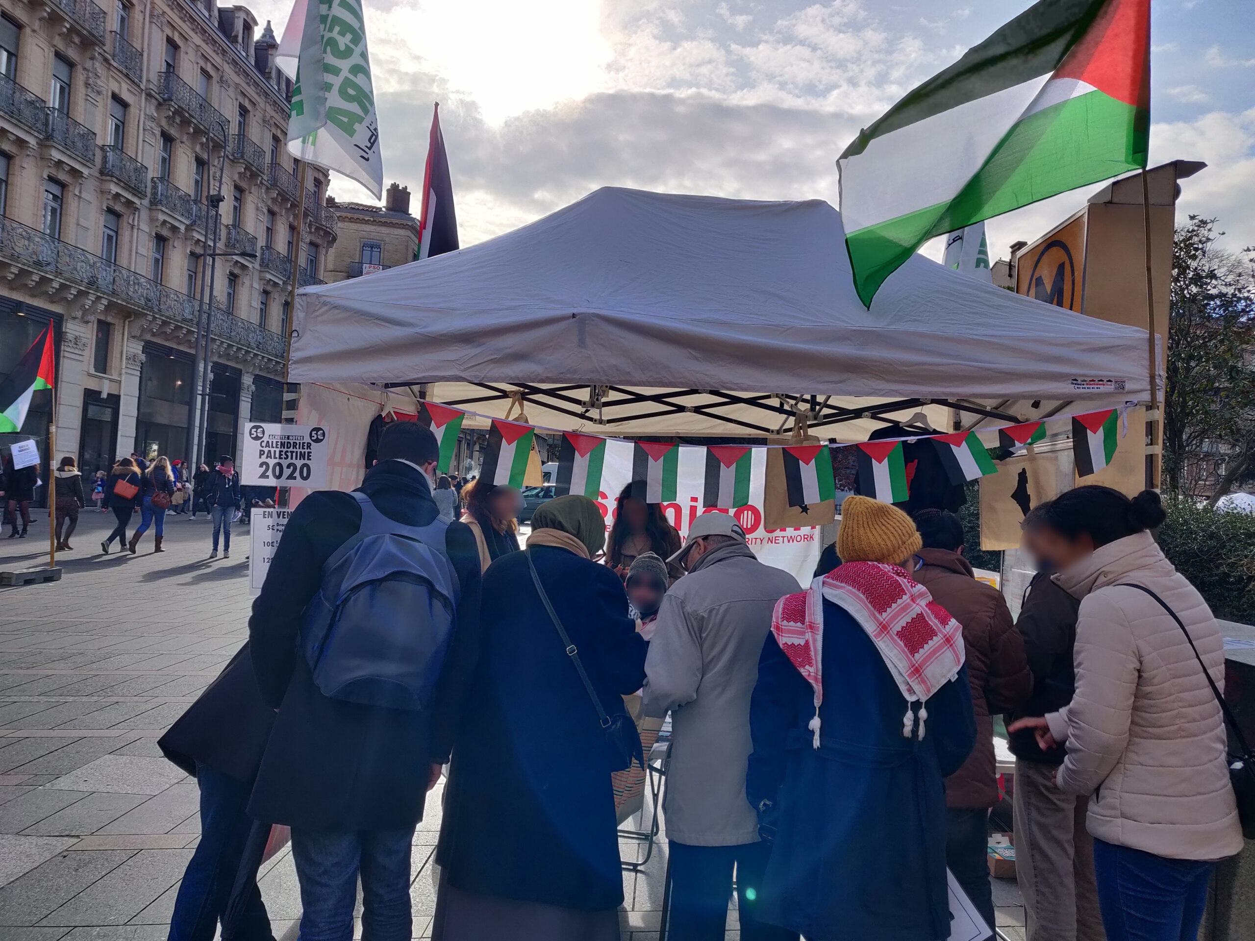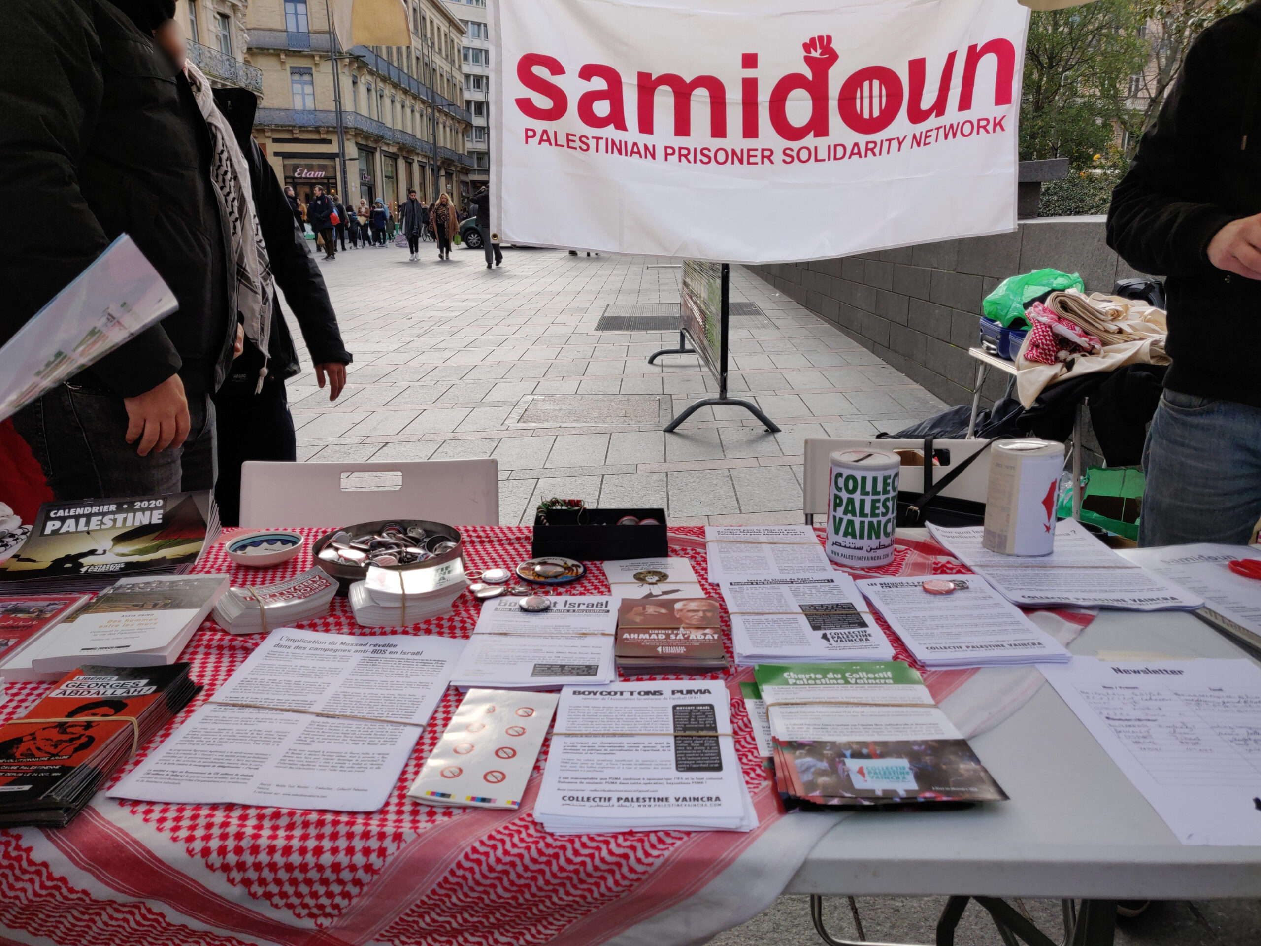 Collectif Palestine Vaincra has been hosting these outdoor stalls on a monthly basis and finding a warm reception among passersby in the city center. Participants distributed over 600 flyers and sold t-shirts, tote bags and calendars supporting Palestinian liberation.