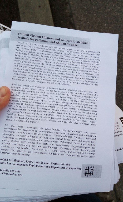 They ensured that Palestinian prisoners and the struggle in Palestine were represented at the march, carrying posters demanding freedom for Ahmad Sa’adat, Georges Abdallah and all Palestinian prisoners. The protests will continue as the WEF approaches, with ongoing protests in Lucerne, Winterthur, Landquart and a mass march on Wednesday in Zurich.