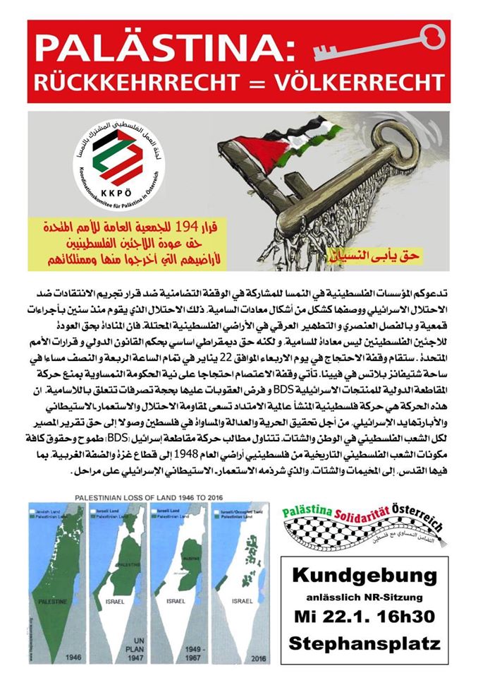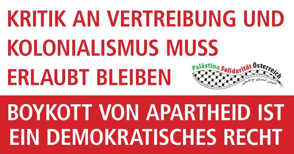 - Vienna, Austria – Wednesday, 22 January. Demonstration: Boycotting Apartheid is a Democratic Right! This is a large, collective demonstration in which many organizations will be participating to defend the BDS movement against attempted criminalization in Austria. Samidoun supports this effort and urges all to participate. 4:30 pm, Stephansplatz, Vienna. Facebook: https://www.facebook.com/events/3073423182691843/