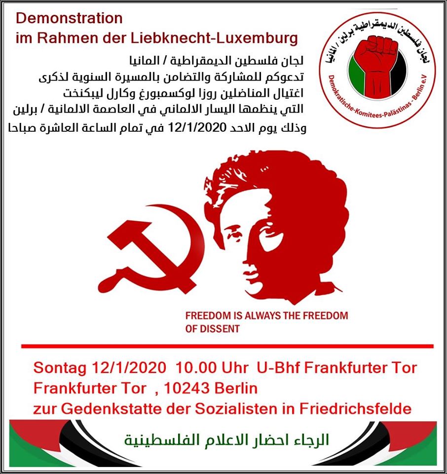 Join the Democratic Palestine Committees and others for a Palestine bloc at the annual Liebknecht-Luxemburg demo, remembering the assassination of Rosa Luxemburg and Karl Liebknecht in 1919.