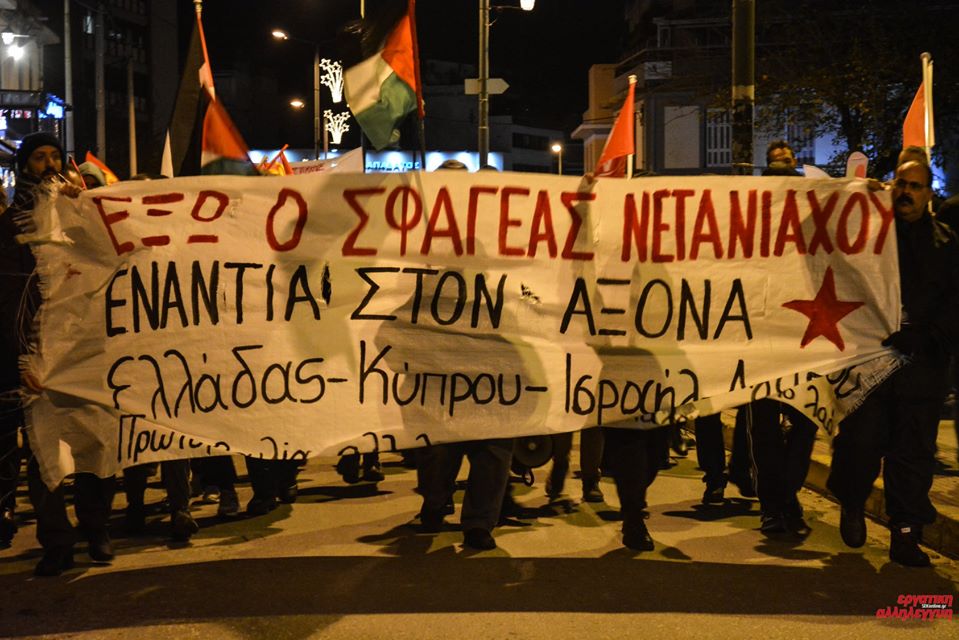 From Palestine, the Popular Front for the Liberation of Palestine urged the Greek movement to stand up against Netanyahu and block the gas deal. “The intensified political, military and economic ties between the Zionist entity and Greece, strengthened by the Syriza government and now heartily embraced by the right-wing regime, come at the expense of the Palestinian and Arab people whose natural resources are being confiscated, stolen and marketed by the illegal occupation….Netanyahu’s visit is an attack on the Palestinian people and the Greek people, their sovereignty and their wealth and resources. The Zionist project provides no solution to economic crisis – only more misery for Greece, Palestine and the world. Indeed, the occupation, allied with the United States, wants to impose hegemony and domination over the entire region of the Mediterranean, opening its resources to plunder and using it as an advance base for expansionist attacks throughout the region.”
