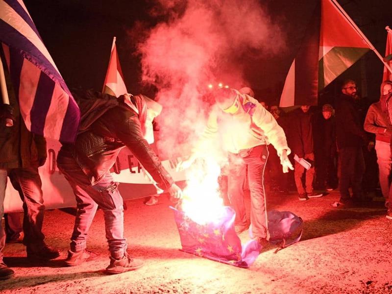 Hundreds marched in an angry demonstration, chanting slogans like “Victory to the Intifada – Liberation for Palestine,” “Netanyahu Kills – Mitsotakis consents,” “No gas deals with Zionism” and more. Participants carried Palestinian flags and banners with the slogans of the demonstration. Outside the Israeli embassy, some demonstrators burned a European Union flag, denouncing the role of the EU in driving Greece into economic crisis and encouraging the construction of the EastMed pipeline.