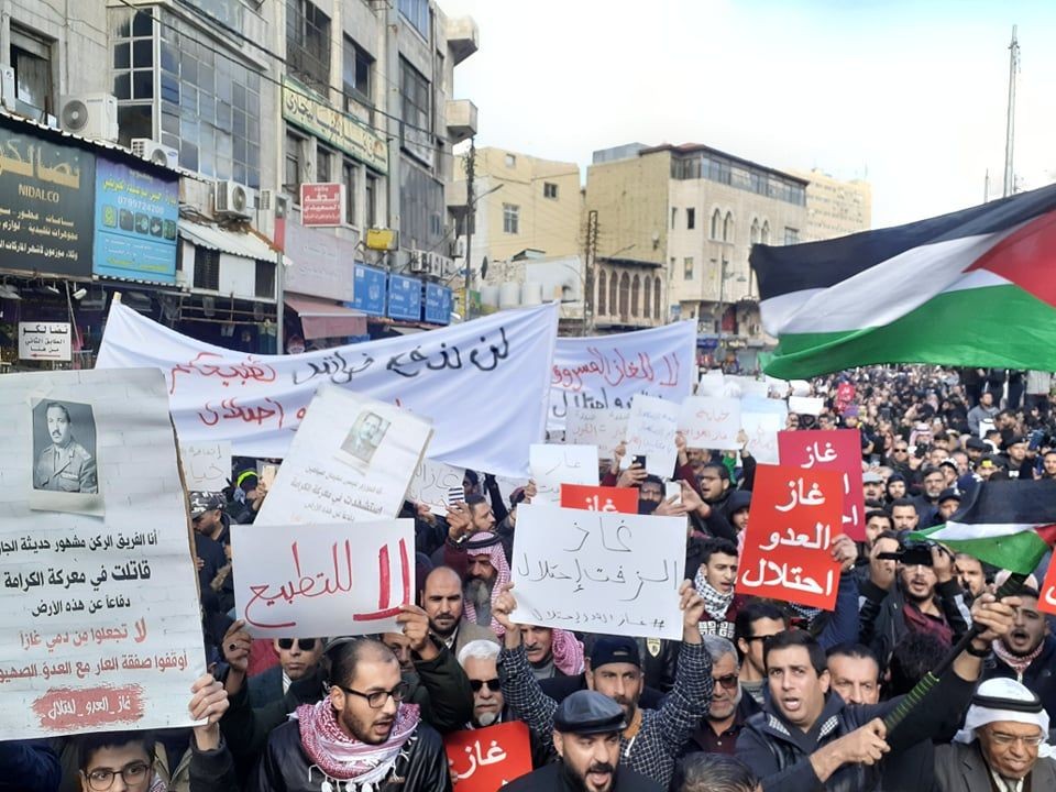 Large crowds of thousands in Jordan also joined the demonstration against the gas deal there on Friday, 3 January, demanding that Jordan reject normalization with the Israeli occupation and declaring that the gas deal puts Jordan in a position of support for the occupation army attacking Palestinians on a daily basis. They also demanded the end of the Wadi Araba agreement with the Israeli occupation.