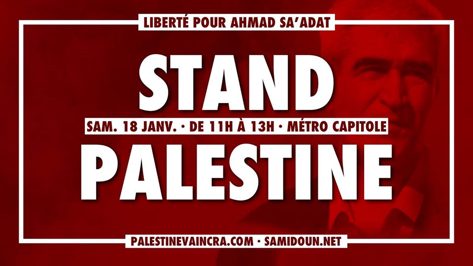 On this occasion, we will organize a Palestine Stand on Saturday January 18 from 11 am to 1 pm to inform about the situation of Ahmad Sa’adat and that of all Palestinian prisoners. Please join us!