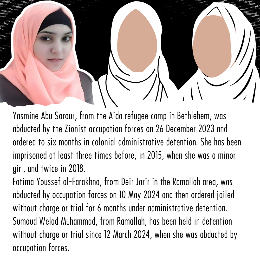 Yasmine Abu Sorour, from the Aida refugee camp in Bethlehem, was abducted by the Zionist occupation forces on 26 December 2023 and ordered to six months in colonial administrative detention. She has been imprisoned at least three times before, in 2015, when she was a minor girl, and twice in 2018.