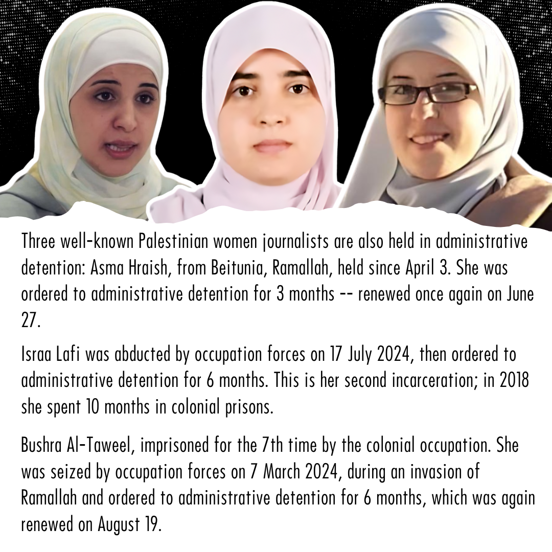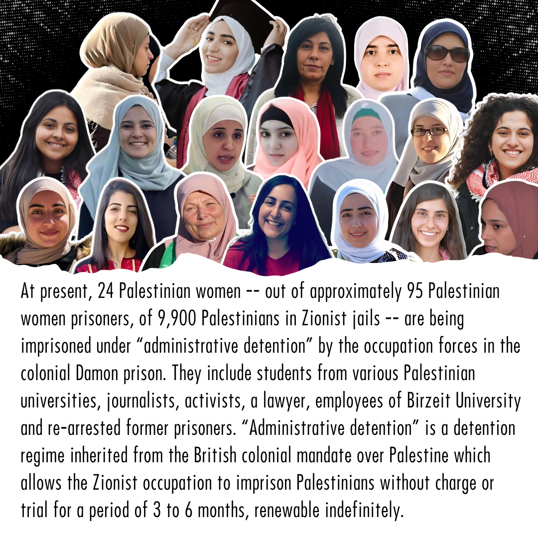 At present, 24 Palestinian women — out of approximately 95 Palestinian women prisoners, of 9,900 Palestinians in Zionist jails, in addition to thousands more from Gaza held in colonial torture camps like that at Sde Teiman — are being imprisoned under “administrative detention” by the occupation forces in the colonial Damon prison. They include students from various Palestinian universities, journalists, activists, a lawyer, employees of Birzeit University and re-arrested former prisoners. “Administrative detention” is a detention regime inherited from the British colonial mandate over Palestine which allows the Zionist occupation to imprison Palestinians without charge or trial for a period of 3 to 6 months, renewable indefinitely.