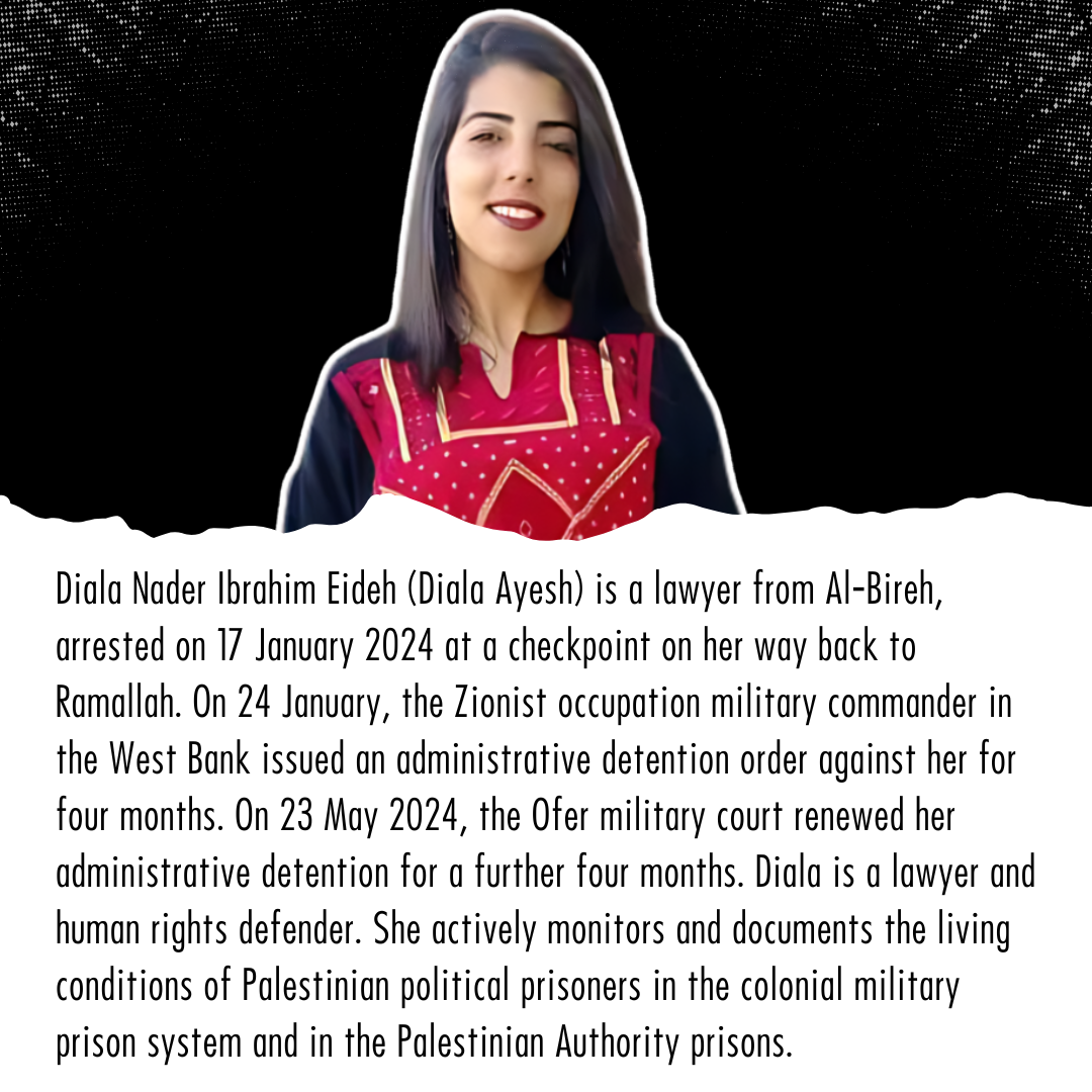 Diala Nader Ibrahim Eideh (Diala Ayesh) is a lawyer from Al-Bireh, arrested on 17 January 2024 at a checkpoint on her way back to Ramallah. On 24 January, the Zionist occupation military commander in the West Bank issued an administrative detention order against her for four months. On 23 May 2024, the Ofer military court renewed her administrative detention for a further four months. Diala is a lawyer and human rights defender. She actively monitors and documents the living conditions of Palestinian political prisoners in the colonial military prison system and in the Palestinian Authority prisons.