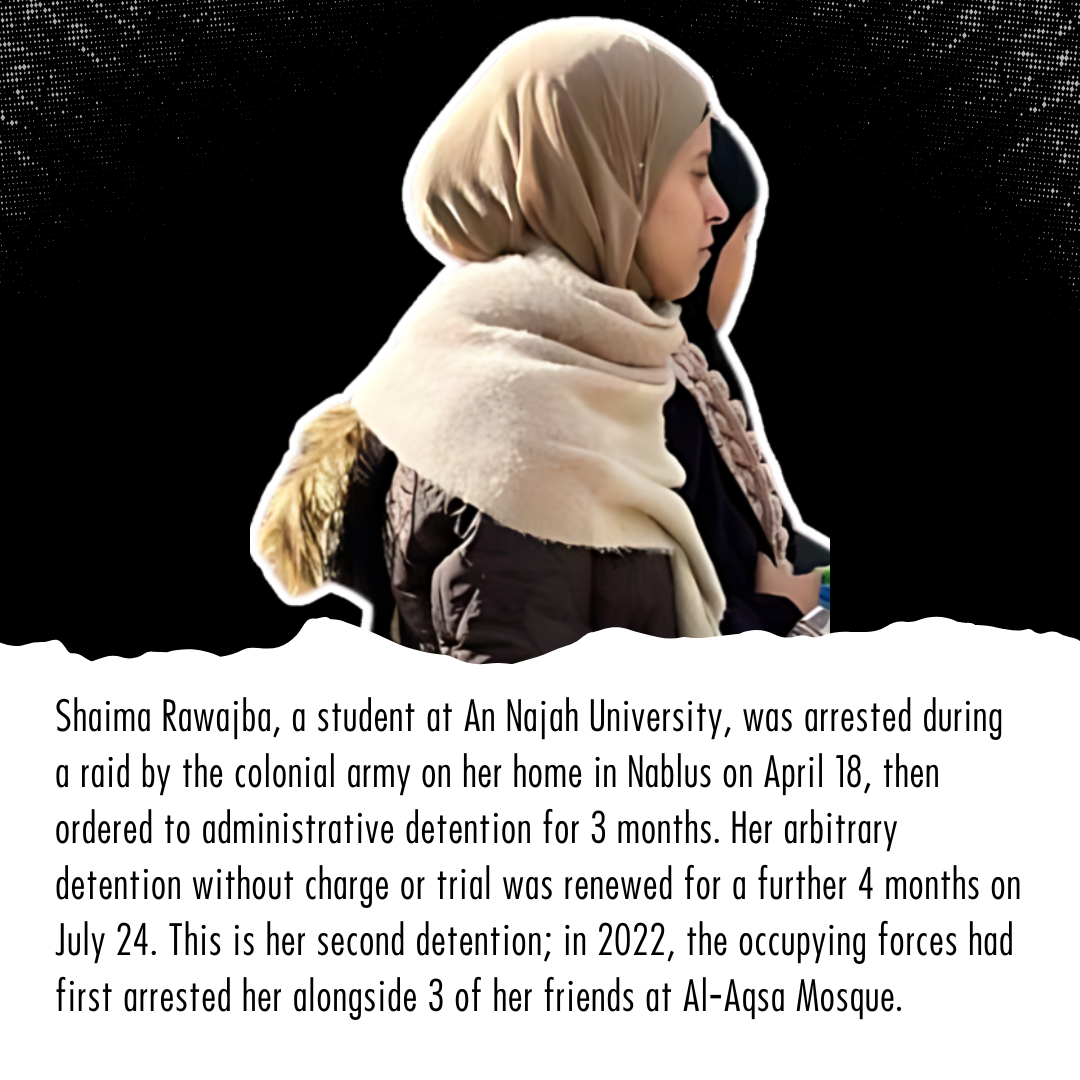 Shaima Rawajba, a student at An Najah University, was arrested during a raid by the colonial army on her home in Nablus on April 18, then ordered to administrative detention for 3 months. Her arbitrary detention without charge or trial was renewed for a further 4 months on July 24. This is her second detention; in 2022, the occupying forces had first arrested her alongside 3 of her friends at Al-Aqsa Mosque.