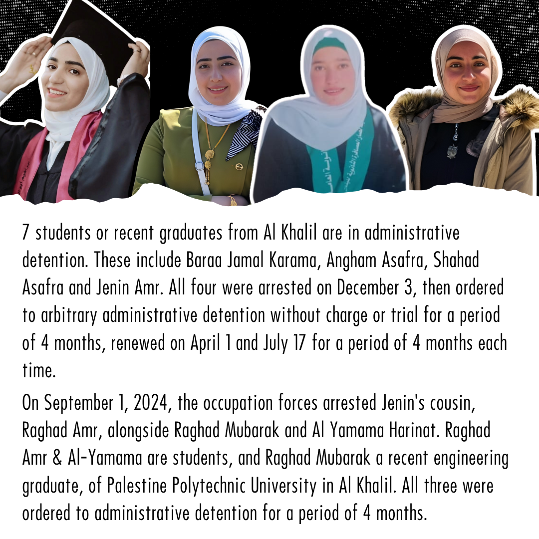 Seven students or recent graduates from Al Khalil are in administrative detention. These include Baraa Jamal Karama, Angham Asafra, Shahad Asafra and Jenin Amr. All four were arrested on December 3, then ordered to arbitrary administrative detention without charge or trial for a period of 4 months, renewed on April 1 and July 17 for a period of 4 months each time.