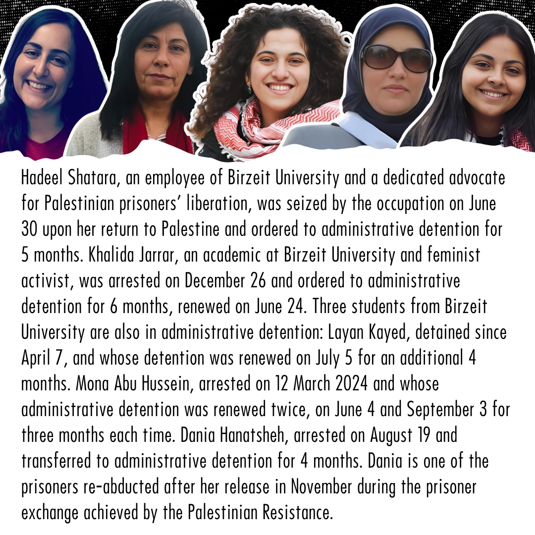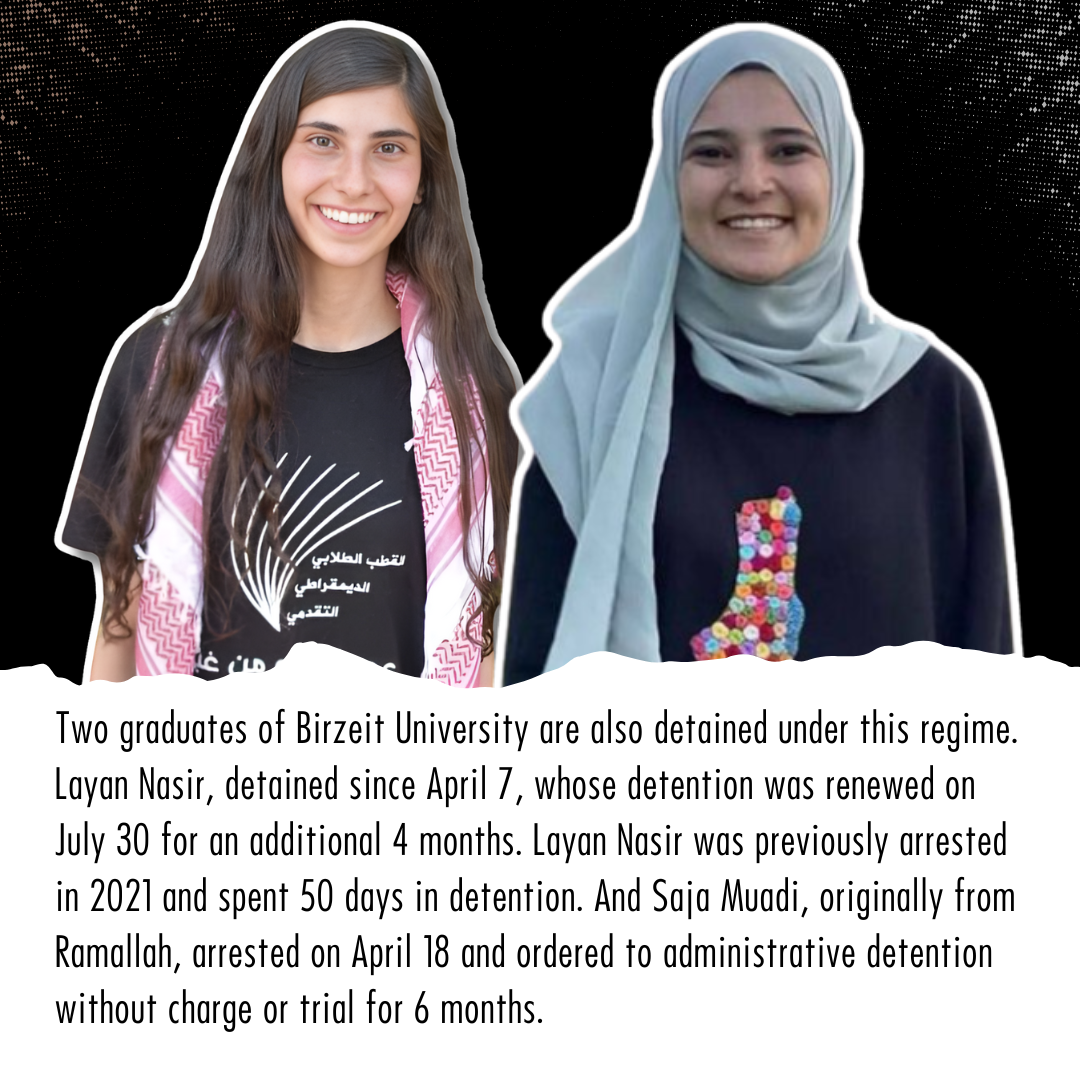 Two graduates of Birzeit University are also detained under this regime. Layan Nasir, detained since April 7, whose detention was renewed on July 30 for an additional 4 months. Layan Nasir was previously arrested in 2021 and spent 50 days in detention. And Saja Muadi, originally from Ramallah, arrested on April 18 and ordered to administrative detention without charge or trial for 6 months.