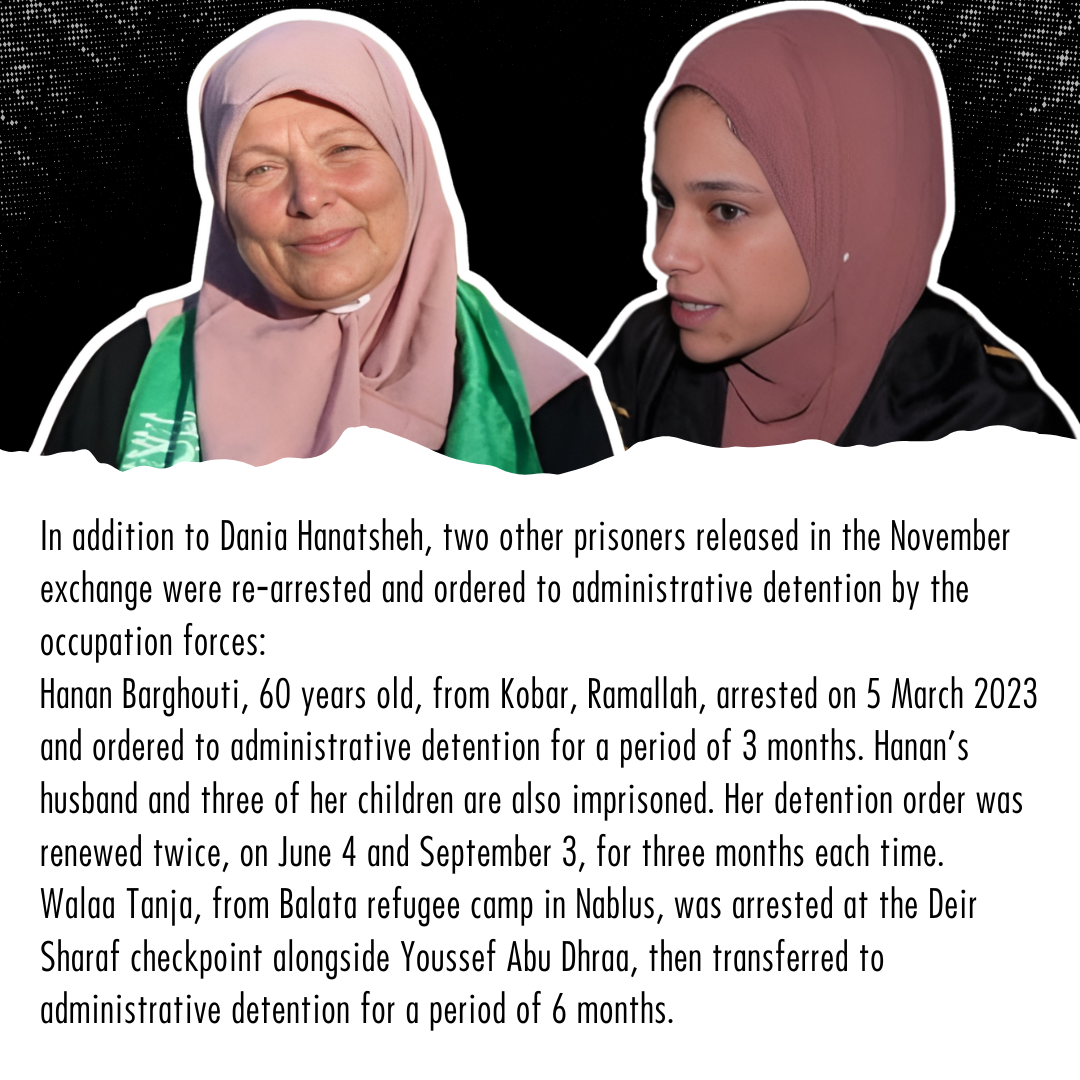 In addition to Dania Hanatsheh, two other prisoners released in the November exchange were re-arrested and ordered to administrative detention by the occupation forces: