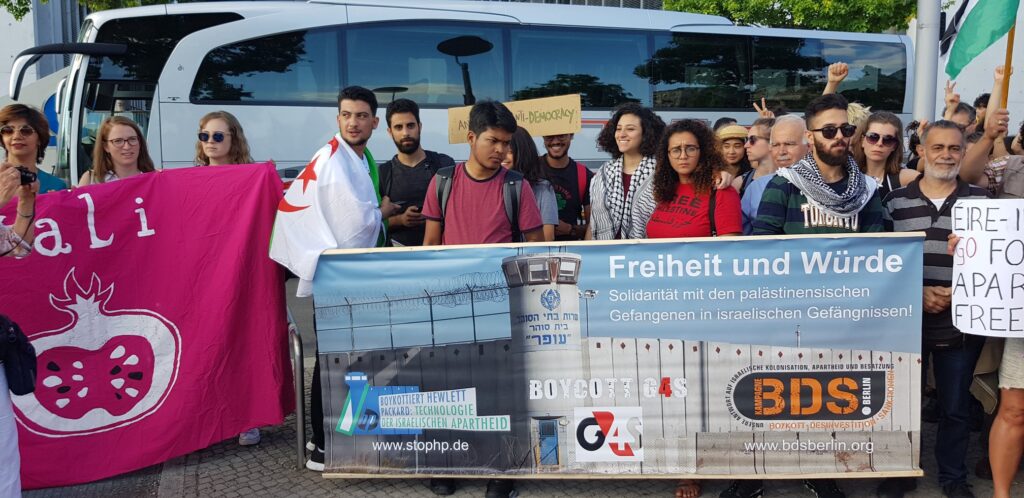 Speakers carried signs and banners supporting the boycott, divestment and sanctions (BDS) movement, including representatives of BDS Berlin, who carried three large letters reading “BDS.” This Palestinian call for international action urges people and organizations around the world to boycott, divest from and sanction Israel and its complicit institutions and multinational corporations until basic human rights of the Palestinian people are implemented: namely, ending the occupation and dismantling the apartheid wall, implementing full equality for Palestinian citizens of Israel and implementing Palestinian refugees’ right of return. Participants expressed their strong support for the campaign, chanting “Free, free Palestine!” and “Yes, yes, BDS!”