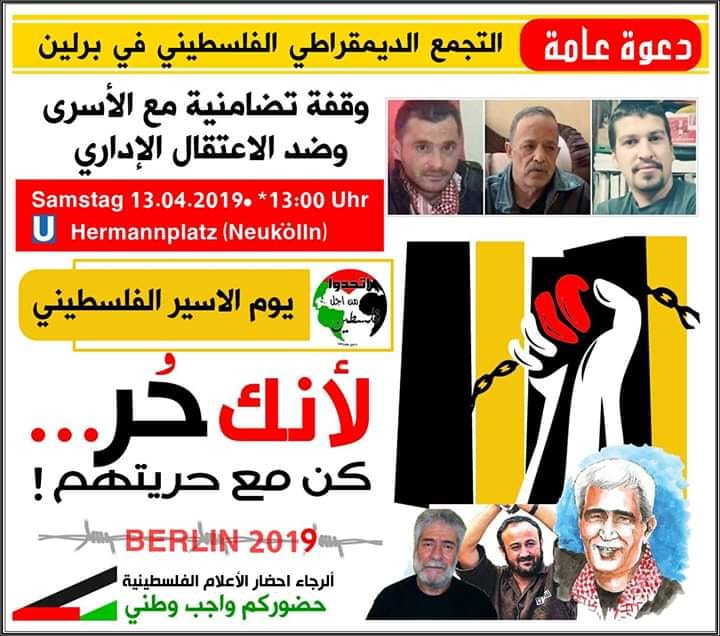 دعا الحراك الشبابي الفلسطيني في برلين جماهير شعبنا الفلسطيني وكافة القوى العربية والالمانية والأممية الصديقة الى المشاركة الواسعة في الفعاليات المساندة لإضراب ومعركة الكرامة الثانية التي تخوضها طلائع الحركة الأسيرة في السجون الصهيونية.