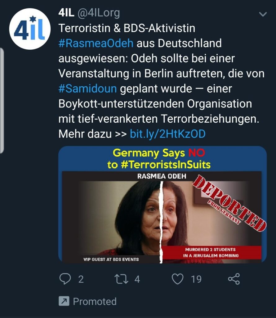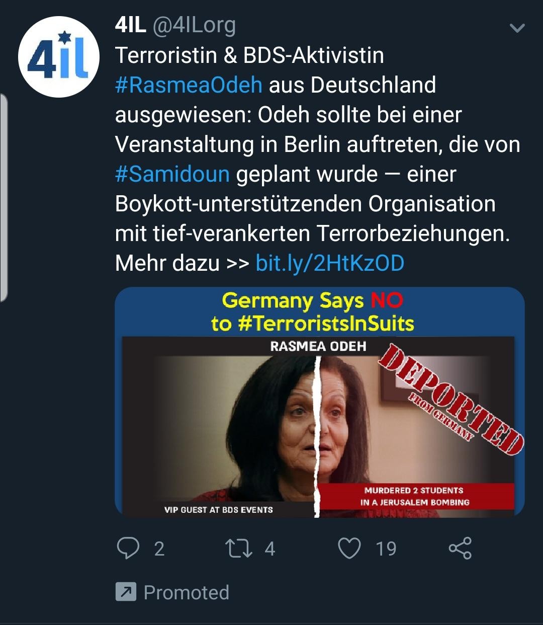 “Palestinian activist Rasmea Odeh was banned from speaking at a public meeting marking International Women’s Day in Berlin on Friday after German officials revoked her visa. The event was titled “Palestinian Women in the Liberation Struggle.” The Israeli government claimed credit for the action. According to the newspaper Haaretz, strategic affairs minister Gilad Erdan issued a statement saying the German decision came after pressure applied by him and “a slew of Jewish organizations in Germany, as well as protest by the Israeli ambassador in Germany.”