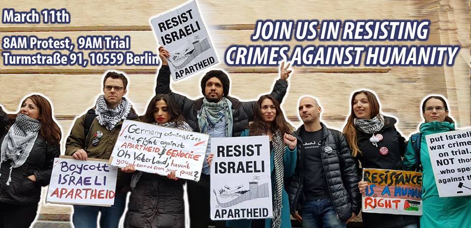 Three human rights activists, two Israelis and a Palestinian, are facing trial in Berlin for disrupting a representative of the Israeli state and challenging her responsibility for war crimes and crimes against humanity.