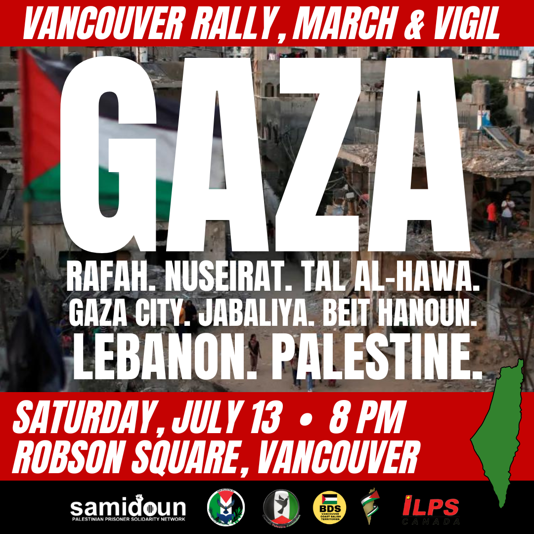 ***ENDORSEMENTS WELCOME! Please email vancouver@samidoun.net with your group name and logo to endorse this rally.***