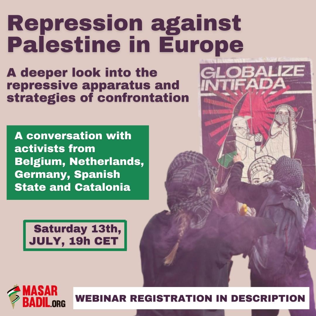Ever since the 7th of October, repression against the pro-Palestine movement in Europe has taken new levels. From banning demonstrations in multiple countries, the prosecution of activists, the media smear campaigns, up to the criminalization of organisations and slogans. The “anti-repression committee” of the Alternative Palestinian Revolutionary Path Movement is organizing this panel, where activists from multiple European countries will share their experiences and analysis of how the repressive apparatus cracks down on the pro-Palestine movement, what goals they try to achieve, and how to fight back ✊🏾