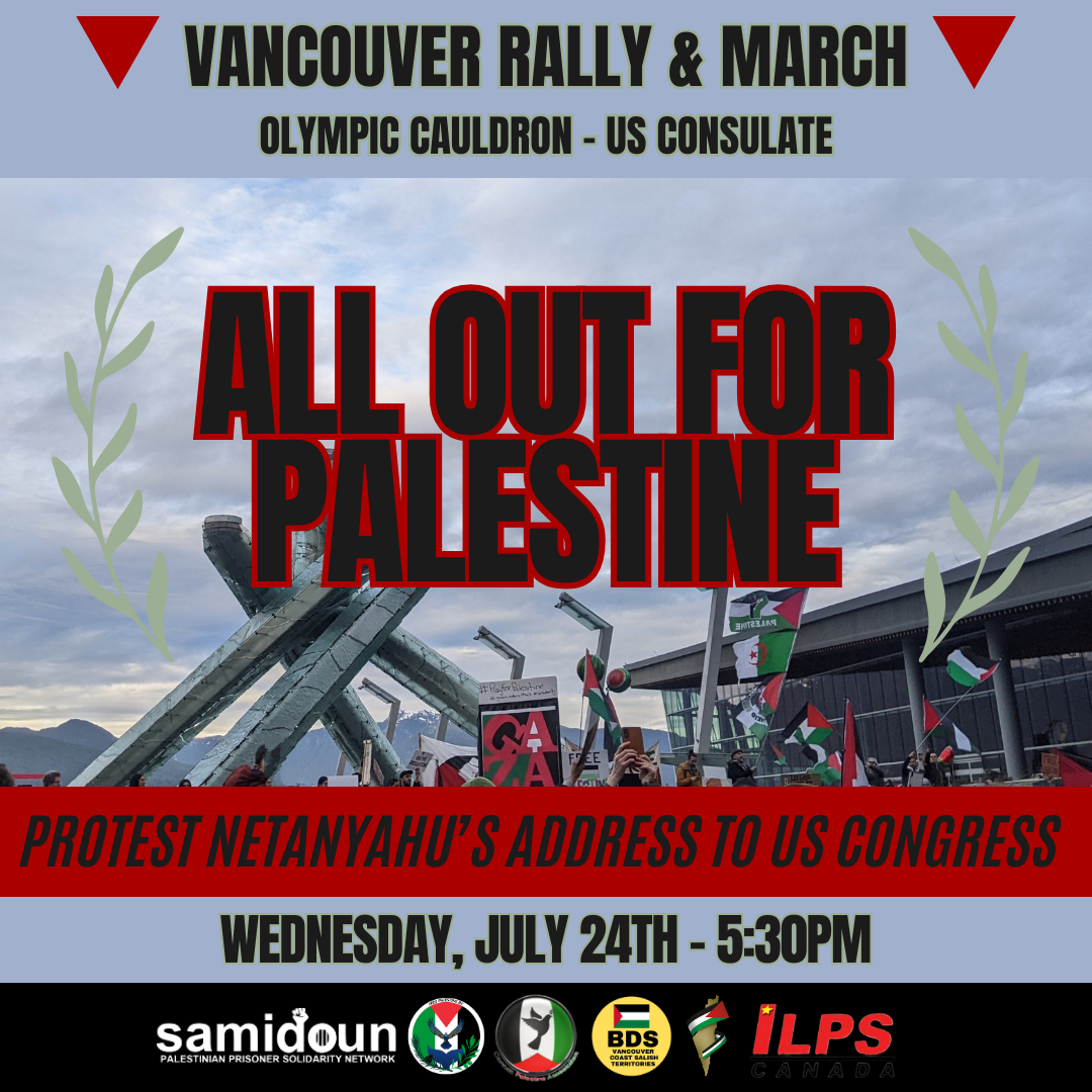 Join us to rally on Wednesday, July 24 — the day Netanyahu is scheduled to speak to the US Congress — to denounce US and Canadian complicity in the Zionist genocide, demand real accountability and call for the liberation of Palestine from the river to the sea!