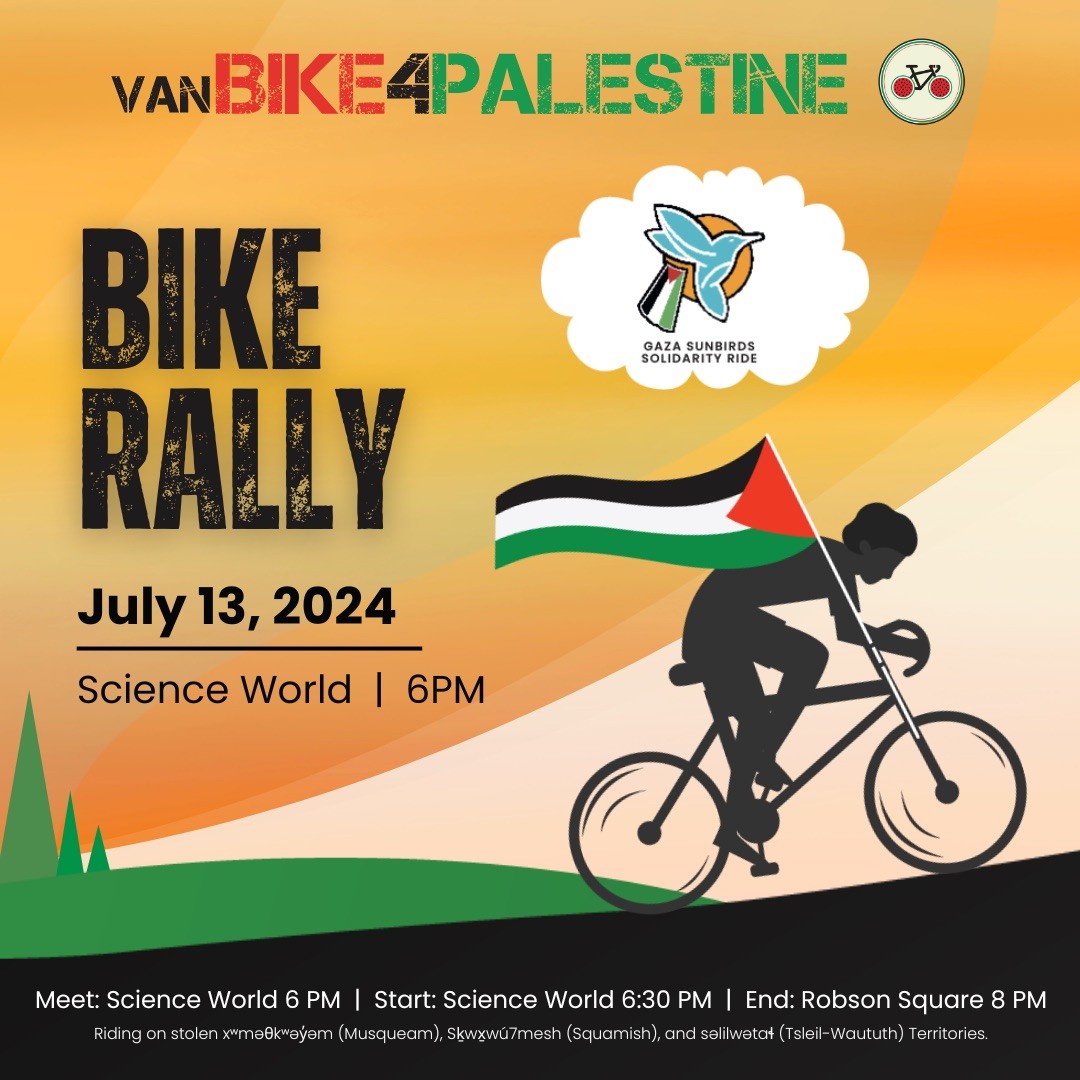 The amazing activists at @vanbike4palestine will be joining us this Saturday July 13 for the evening rally, march and vigil for the martyrs.
