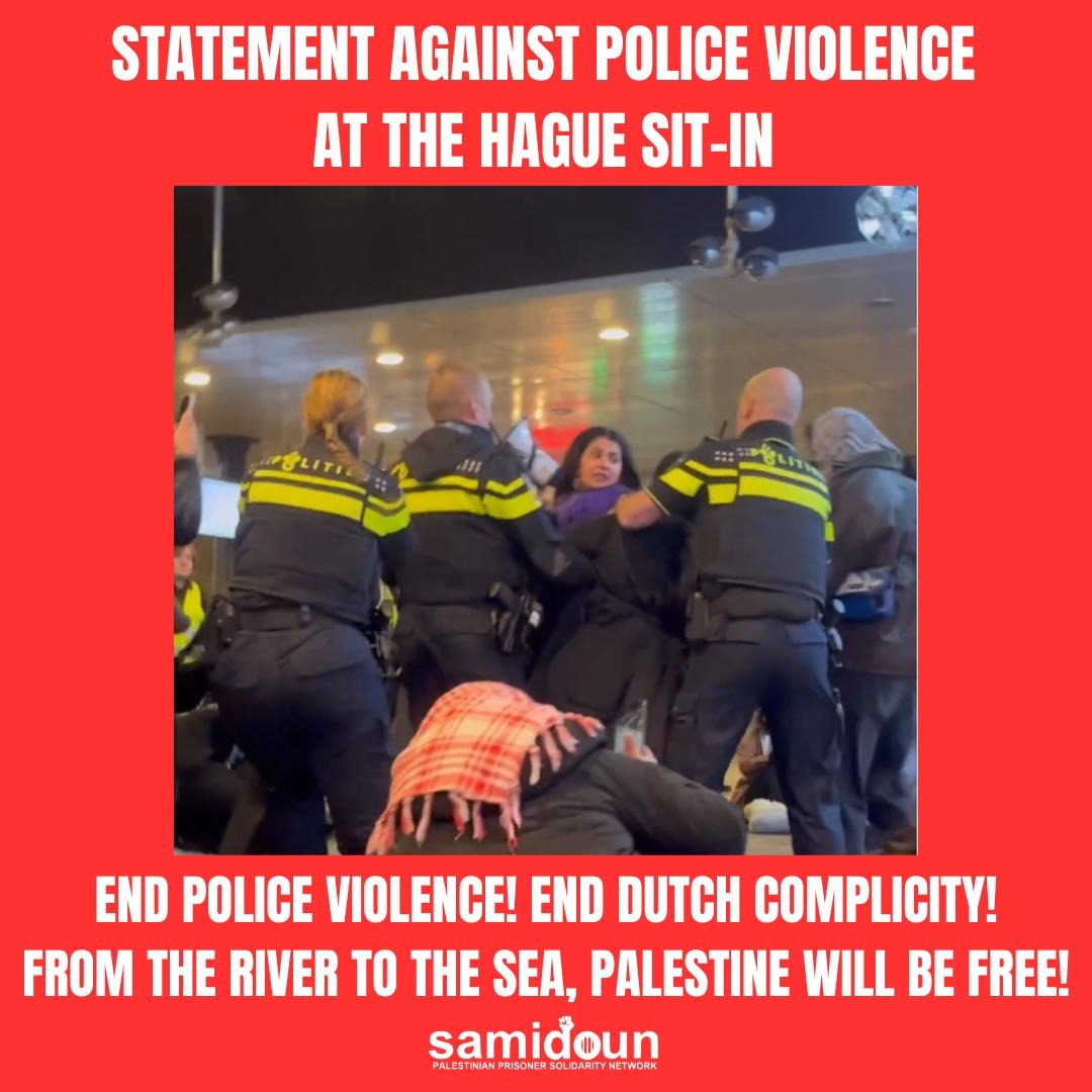 Samidoun Palestinian Prisoner Solidarity Network denounces the arrest of Palestinian activists at the The Hague Central Station sit-in on 1 February 2023 by the Dutch police. With the excuse that it is “forbidden to use a megaphone,” an activist leading chants during the sit-in was arrested by force. Multiple protestors were punched and attacked by the police and then another activist was arrested. One activist is in the hospital with serious injuries to their arm. As Samidoun, we denounce this attack as part of the Dutch state support for the Israeli occupation and demand our collective right to protest.