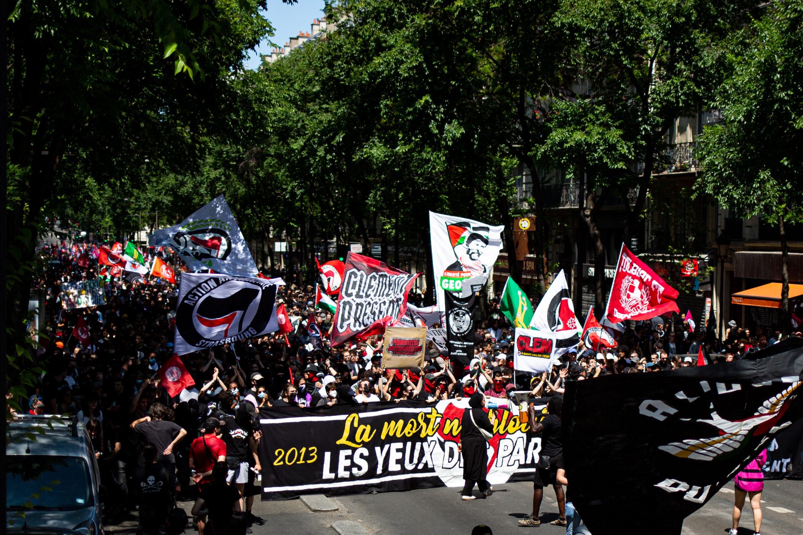 Throughout the march route, chants and songs animated the procession from Barbes to Gambetta. Accompanied by a multitude of torches, a sea of double-masted flags rose around Gare de l’Est to pay tribute to the struggles and figures of the radical and anti-imperialist left. Thus mingled the faces of Zineb Redouane and Olivio Gomes (murdered by police officers on duty), Clément Méric and Carlos Palomino (killed by neo-Nazis), references to the struggles of the Kurdish, Kanak and Palestinian peoples as well as support for Georges Abdallah.