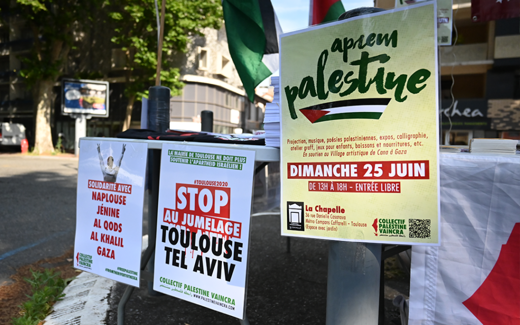 The Collectif Palestine Vaincra distributed thousands of flyers recalling that “fighting the government and employers also means denouncing the French government’s unconditional support for the Israeli occupation and its privileged diplomatic, political and economic relations. It is also to denounce the continuous crimes against the Palestinian people!” Passing in front of our stand, several contingents in the demonstration, like that of the CGT SELA 31 chanted their solidarity with Palestine!