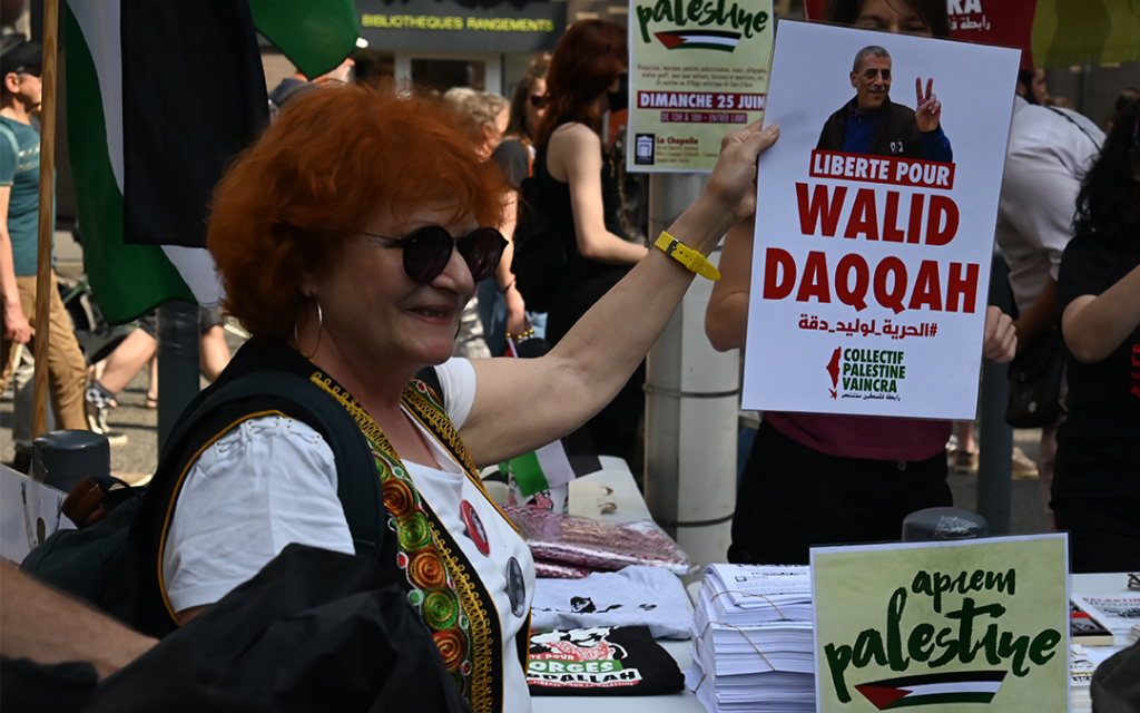 Members of the Collectif Palestine Vaincra — a member organization of the Samidoun Network — drew demonstrators’ attention to the urgent international campaign for the release of Walid Daqqah. This writer and freedom fighter has been imprisoned since 1986 by the Israeli occupation. Today he suffers from myelofibrosis, a rare bone marrow cancer, and needs proper medical treatment which he can only get outside of prison, especially a bone marrow transplant.
