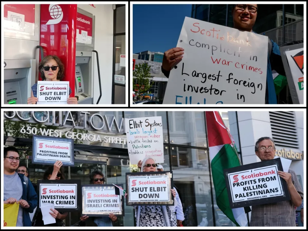 Teresa Diewert, a member of BDS Vancouver-Coast Salish, pointed out: “While working people struggle to make ends meet, Banks make massive profits while investing in machines of war and death. Scotia Banks’ investment in Elbit Systems makes them complicit in war crimes against the Palestinian people in particular and Canadians should be demanding that Scotia Bank divest from Elbit Systems now.”