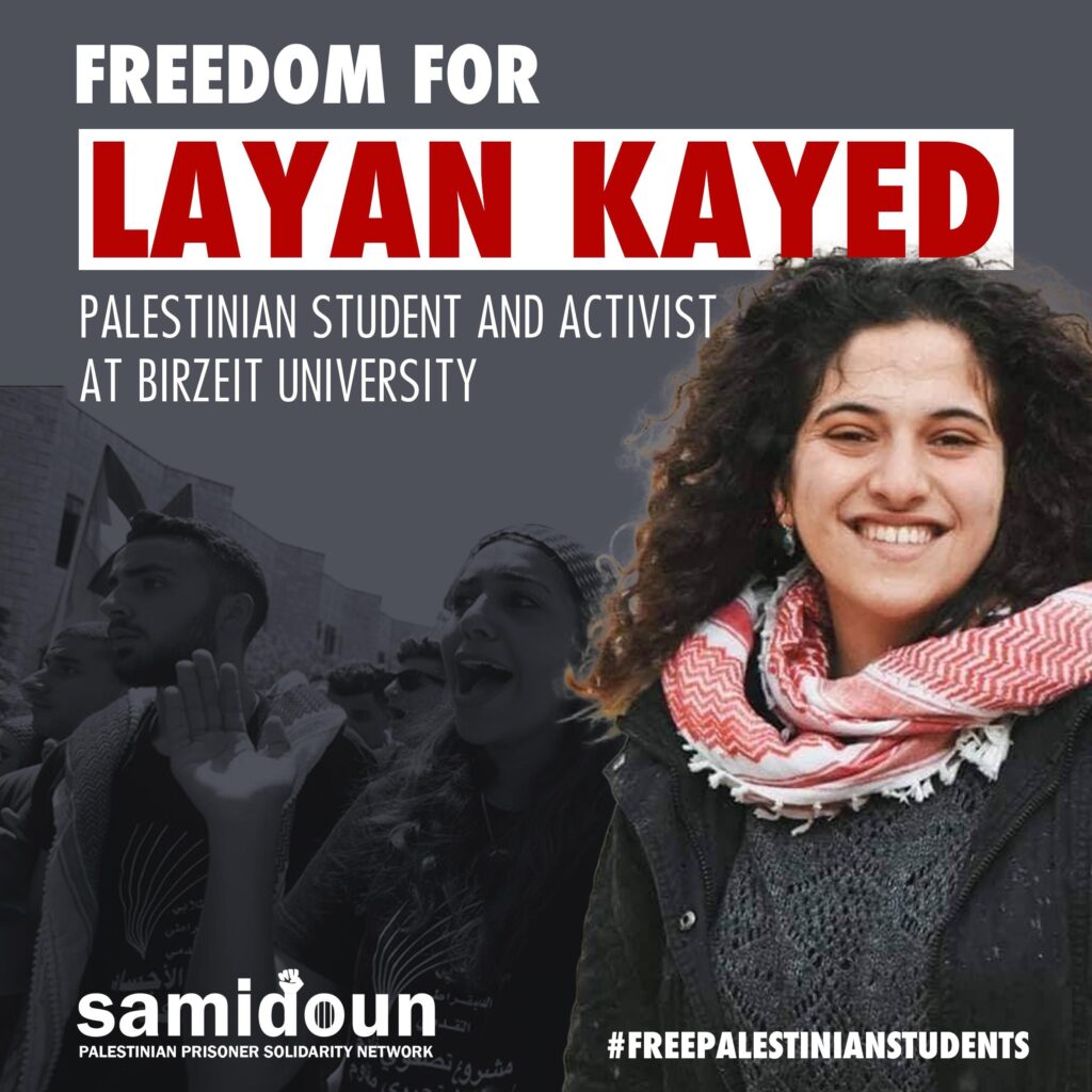 Samidoun Palestinian Prisoner Solidarity Network demands the immediate release of Layan Kayed, her fellow detained students, and all 5,000 Palestinian prisoners in Israeli occupation jails. We urge all student organizations and movements to stand in solidarity with Layan and all detained Palestinian students by escalating the boycott and isolation of the Israeli occupation regime, particularly the academic boycott. We urge all to join the campaign to #FreePalestinianStudents and build international solidarity with Palestinian students — and the Palestinian people as a whole — in the struggle for liberation from colonization, apartheid and occupation!