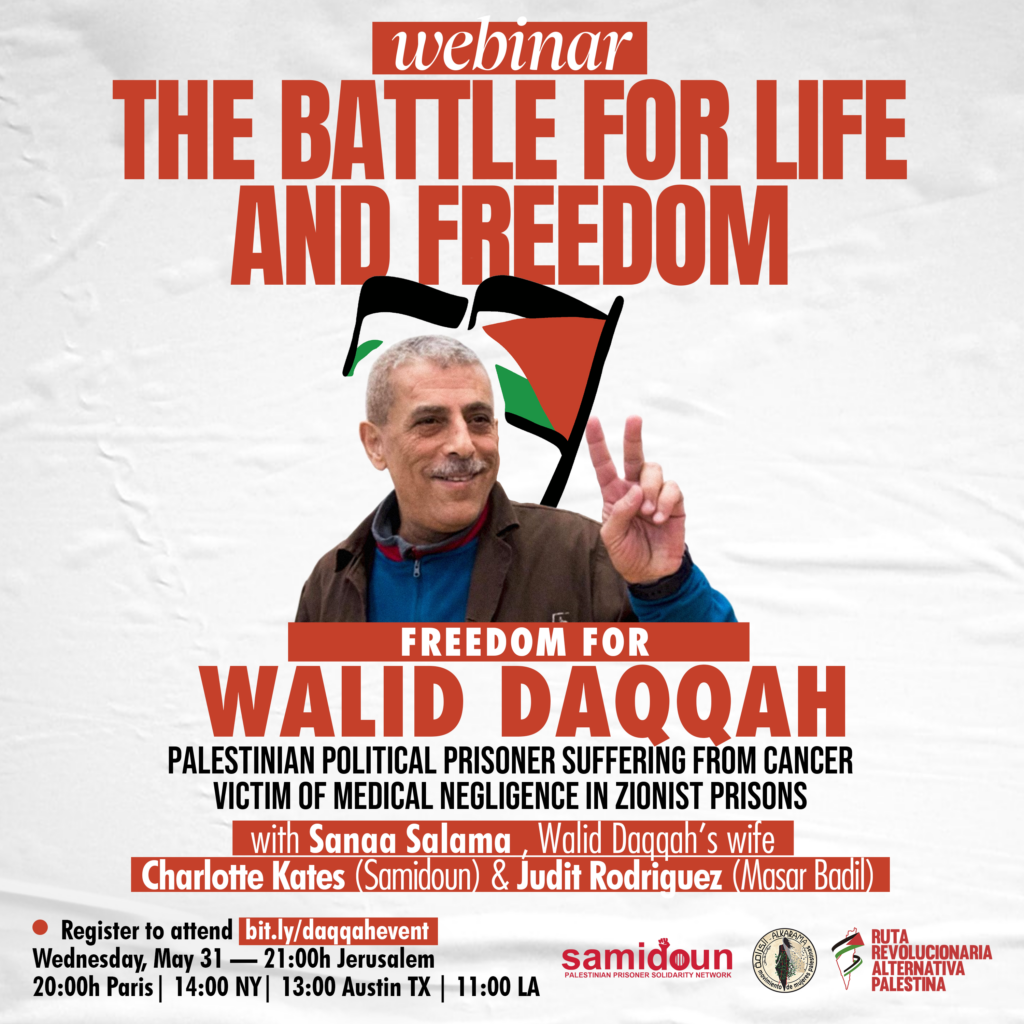 Walid Daqqah needs serious and proper treatment for his lungs, kidneys and blood, as well as a bone marrow transplant. This requires a clean therapeutic environment, where exposure to infection is minimal. This is not the case in colonial prisons. We invite all organizations and supporters of the Palestinian people to join this international campaign launched from Palestine by his family and loved ones to demand his immediate release!