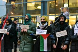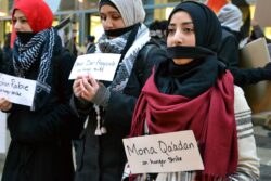 Young women stood along the curb with black cloth tied over their mouths, holding signs with the names of Palestinian hunger strikers, including Samer Issawi and other prisoners on hunger strike to protest their inhumane and illegal detainment in Israeli prisons. Issawi continues on his hunger strike, now past its 225th day. He has vowed not to break it until he wins an absolute agreement that guarantees his release. The protest also supported Palestinian administrative detainees Jafar Azzidine and Tarek Qa’adan, whose hunger strikes have gone on for 91 days