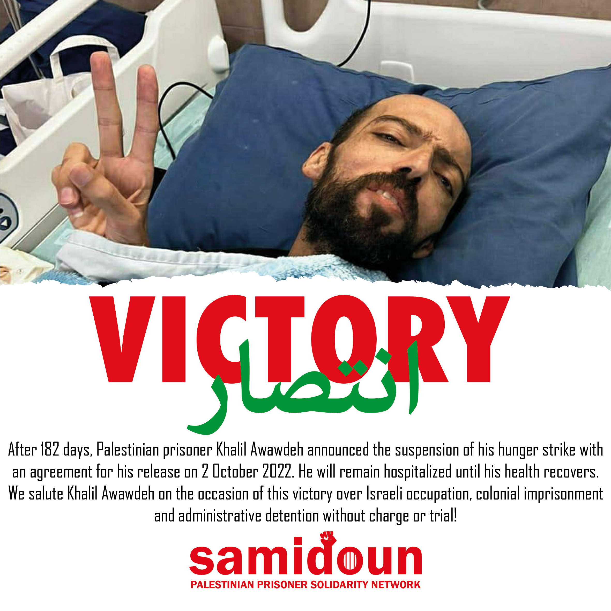 Samidoun Palestinian Prisoner Solidarity Network salutes the prisoners’ movement on this important achievement, coming one day after the victory of Khalil Awawdeh after 182 days of hunger strike.