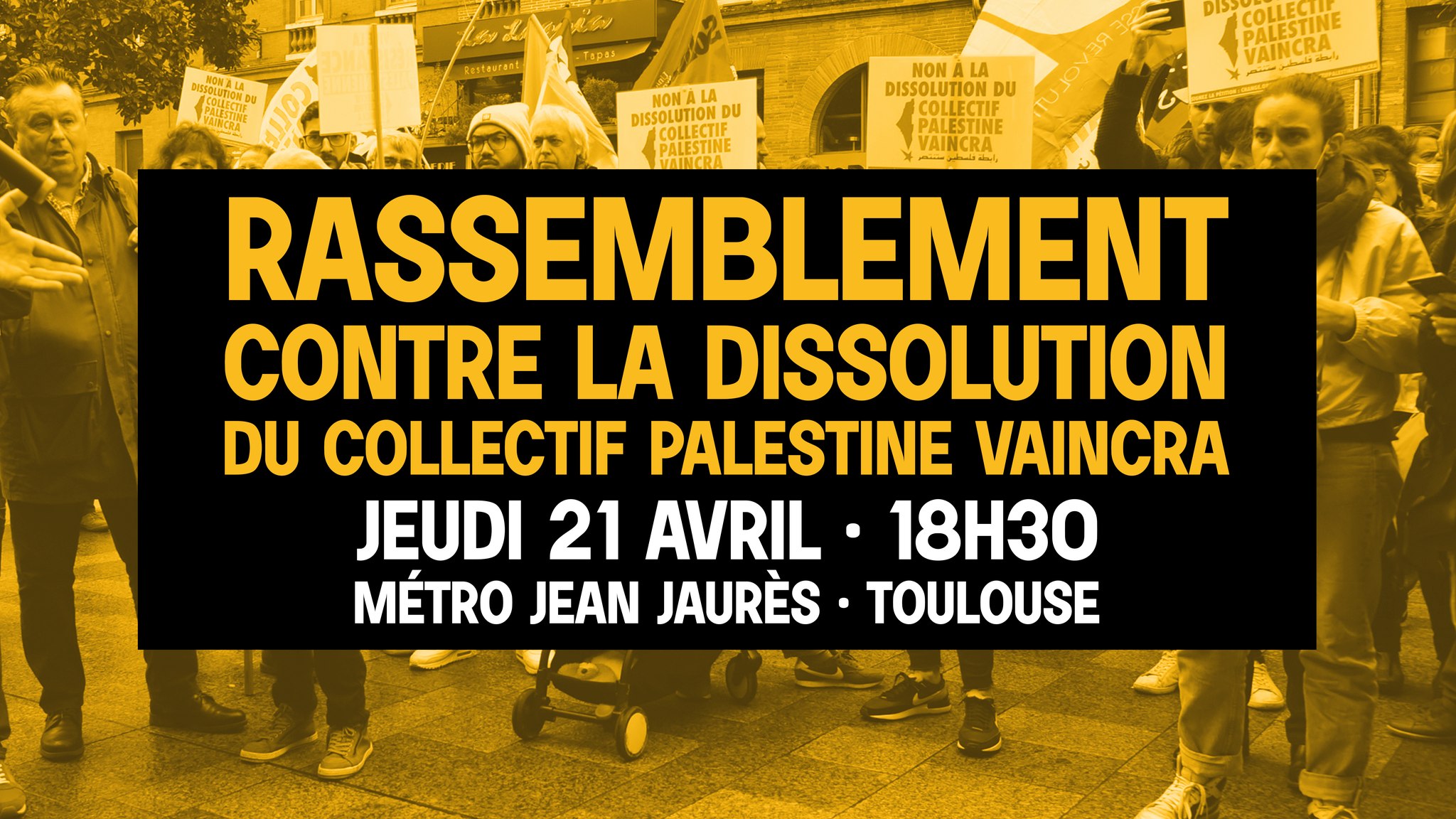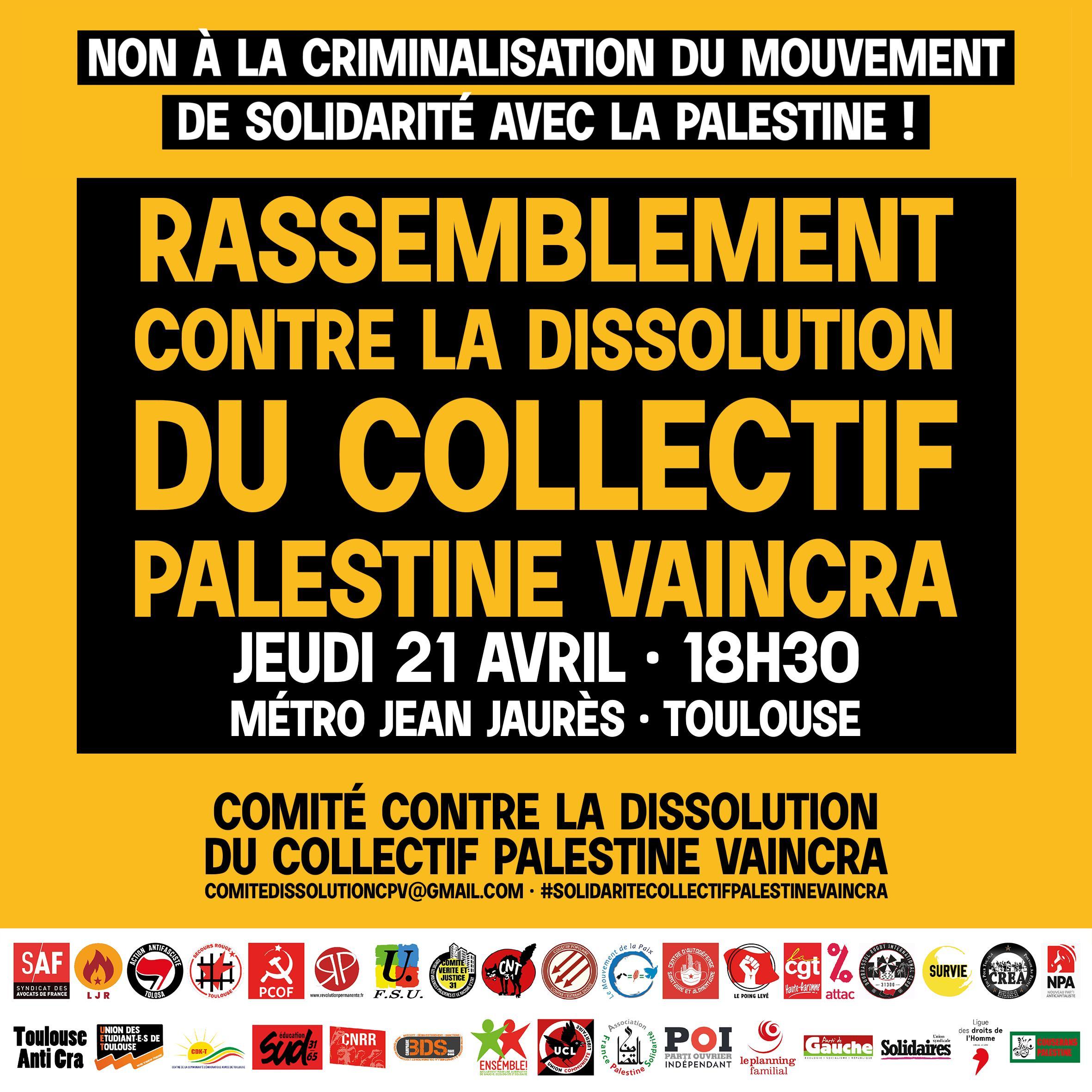 The Committee against the Dissolution of the Collectif Palestine Vaincra, which brings together trade unions, political organizations, collectives and associations, calls for a week of mobilization from 15 to 22 April 15 against the dissolution of the Collectif Palestine Vaincra and against the criminalization of solidarity with Palestine, in the days leading up to the appeal to the Council of State by the Toulouse collective.