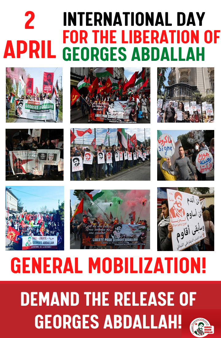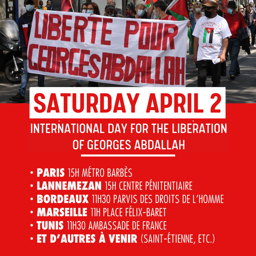 At the call of the Unitary Campaign for the Liberation of Georges Abdallah and various support committees, let’s make April 2 a day of mobilization for the release of the oldest political prisoner in Europe.