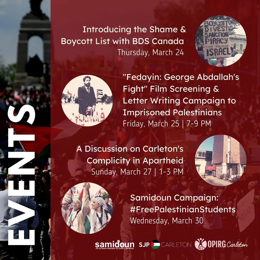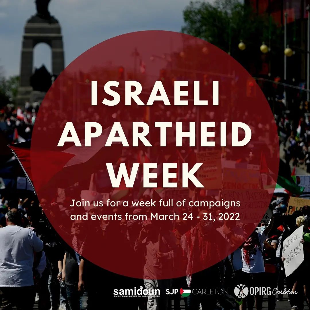 From this Thursday, March 24 to next Thursday, March 31, join OPIRG Carleton and SJP Carleton for a week full of campaigns and events during Israeli Apartheid Week. Check out our list of events so far below.