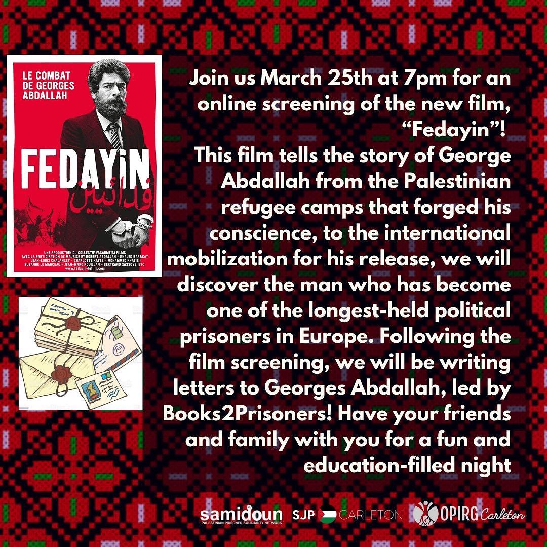 Following the film screening, we will be writing letters to Georges Abdallah, led by the @books2prisonersottawa!